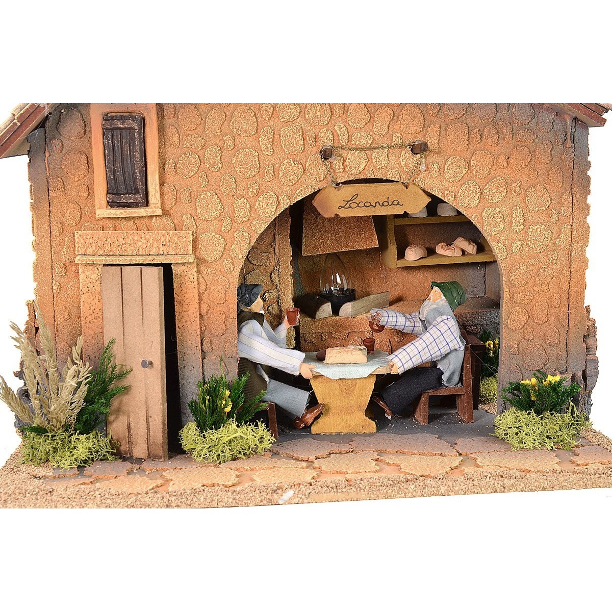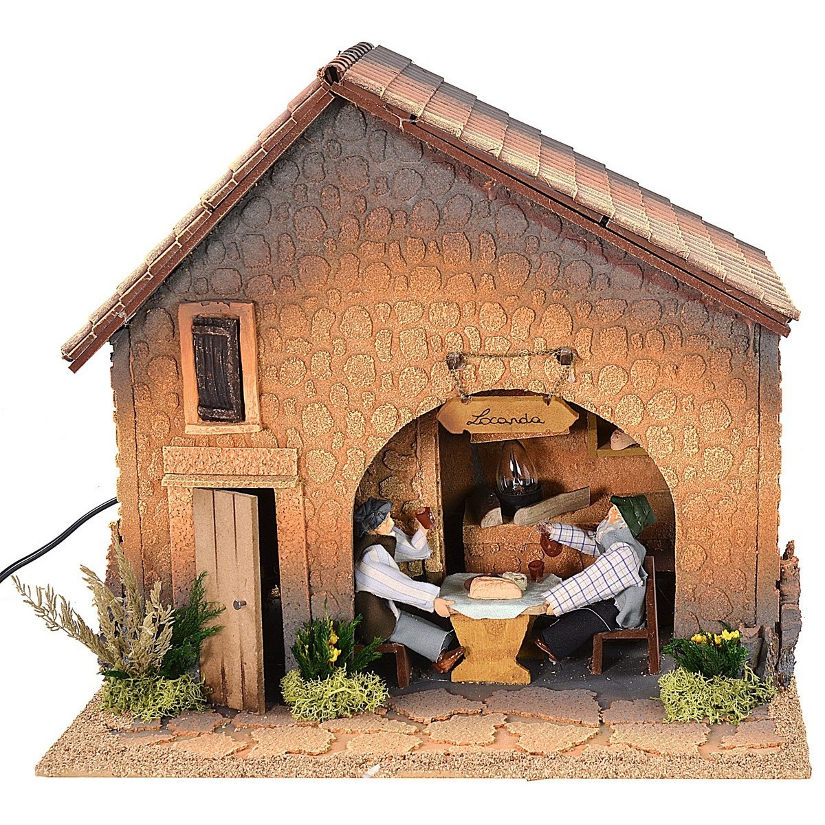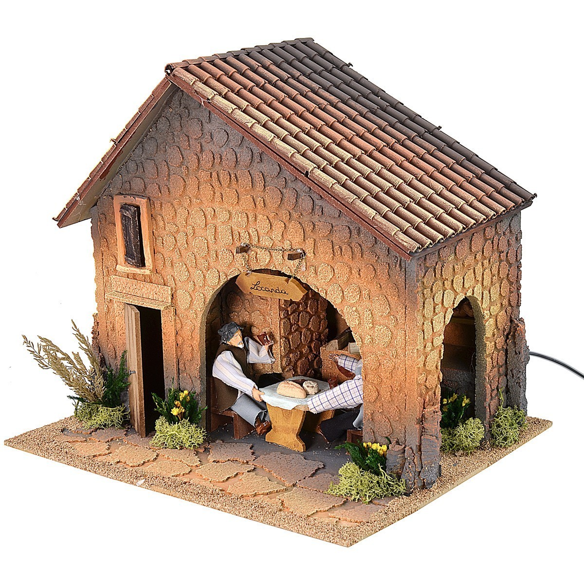 Taberna para belén iluminada, muy bonita y acabada en los más mínimos detalles: muros de piedra, techos con tejas, carpintería de madera, además de toda la vegetación decorativa. La escena presenta los movimientos de dos hombres de la serie de 12 cm sentados en la mesa puesta de la posada donde están cenando, uno levanta el vaso para beber y el otro vierte el vino de la jarra. Al fondo, una gran chimenea atrae la atención gracias a la luz de la llama que arde. La taberna crea una atmósfera muy sugestiva dada por los movimientos, el fuego y la iluminación que funcionan con corriente. El artículo está hecho a mano por artesanos italianos y es adecuado para estatuas de altura de 12 cm.