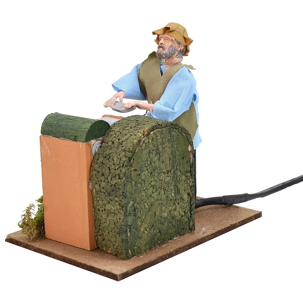 Afilador de 12 cm en movimiento, mueve lateralmente los brazos para afilar las cuchillas en la piedra, haciendo la escena verosímil. La estatua presenta un rostro de terracota muy expresivo y está cuidadosamente vestida con ropa de tela, cada pieza está hecha completamente a mano por artesanos italianos, por lo que los colores y la ropa pueden variar. El artículo funciona con corriente eléctrica.