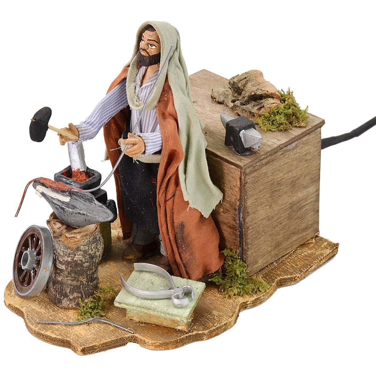 Herrero de 12 cm en movimiento, mueve el brazo con el que sostiene el martillo para golpear el hierro al rojo vivo; la escena está adornada con un yunque, un martillo y otras herramientas de trabajo. La estatua presenta un rostro de terracota muy expresivo y está cuidadosamente vestida con ropa de tela, cada pieza está hecha completamente a mano por artesanos italianos, por lo tanto, los colores y la ropa pueden variar. El artículo funciona con corriente eléctrica.