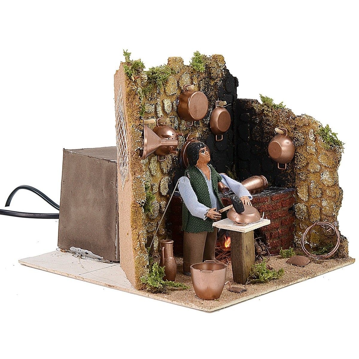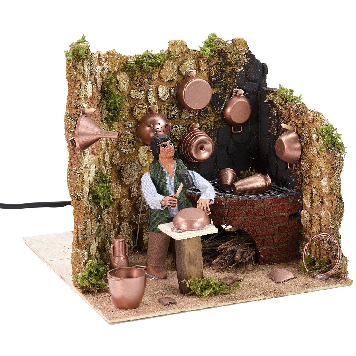 Cobre en movimiento que golpea con el martillo sobre una cacerola de cobre para trabajarlo, realizado en terracota por manos artesanas italianas expertas, presenta un horno con efecto de fuego que funciona con corriente, lo que ayuda a dar vida a la escena. La escena está cuidada en los más mínimos detalles, el ambiente está lleno de detalles como los objetos de cobre ya trabajados, las piezas descartadas en el suelo, la mancha de humo negro en la pared detrás del horno, las ramas de árbol utilizadas como fuente de energía.