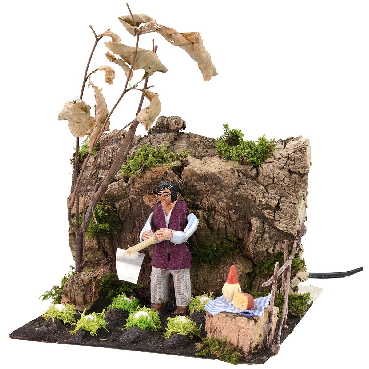 Zapador en movimiento que sube y baja los brazos con los que sostiene la azada que utiliza para trabajar la tierra debajo, realizado en terracota por expertas manos artesanas italianas. La escena está cuidada en los mínimos detalles, el entorno es rico en detalles como la comida sobre el tronco de madera para el descanso del trabajador, los productos que está cavando, el árbol real al fondo de la escena.
