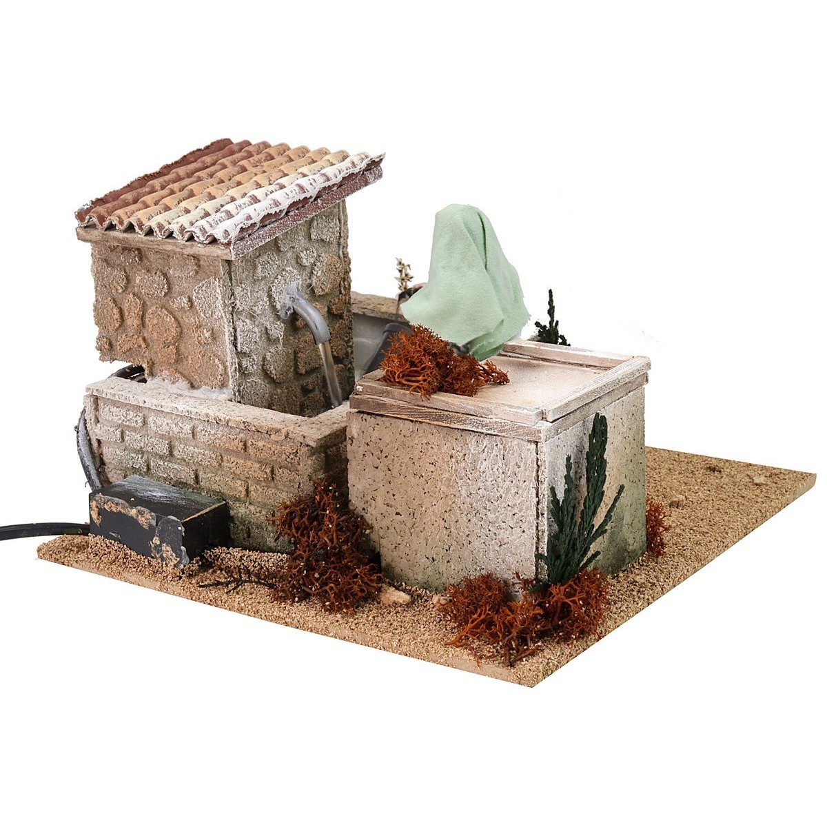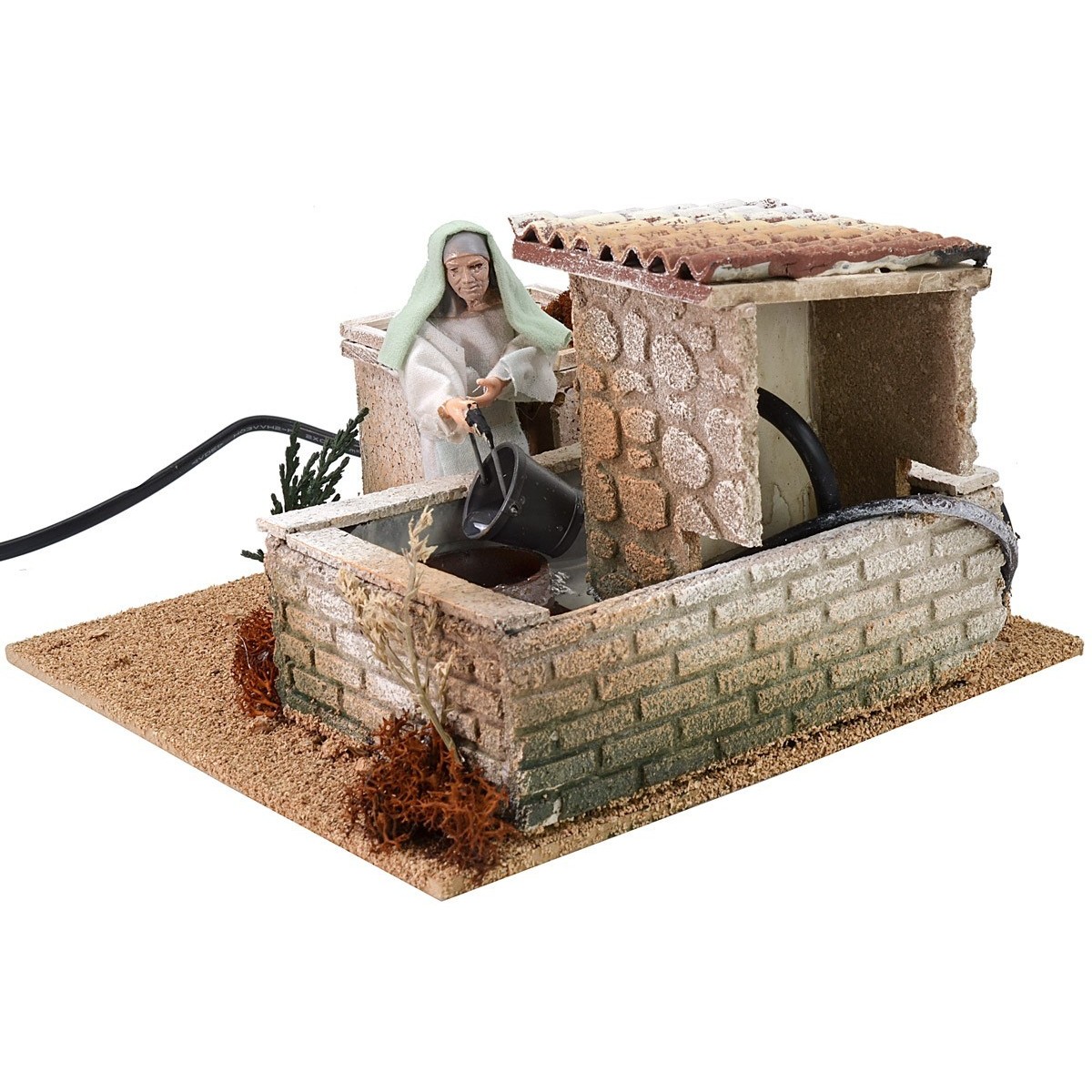 Mujer en movimiento que sube y baja el brazo con el que sostiene el asa del cubo que usa para tomar agua de la fuente, realizado en terracota por hábiles manos artesanas italianas. La escena está cuidada en los más mínimos detalles, el ambiente está lleno de particularidades como, por ejemplo, el diseño de ladrillos de la fuente, la ropa de la mujer, la vegetación circundante.