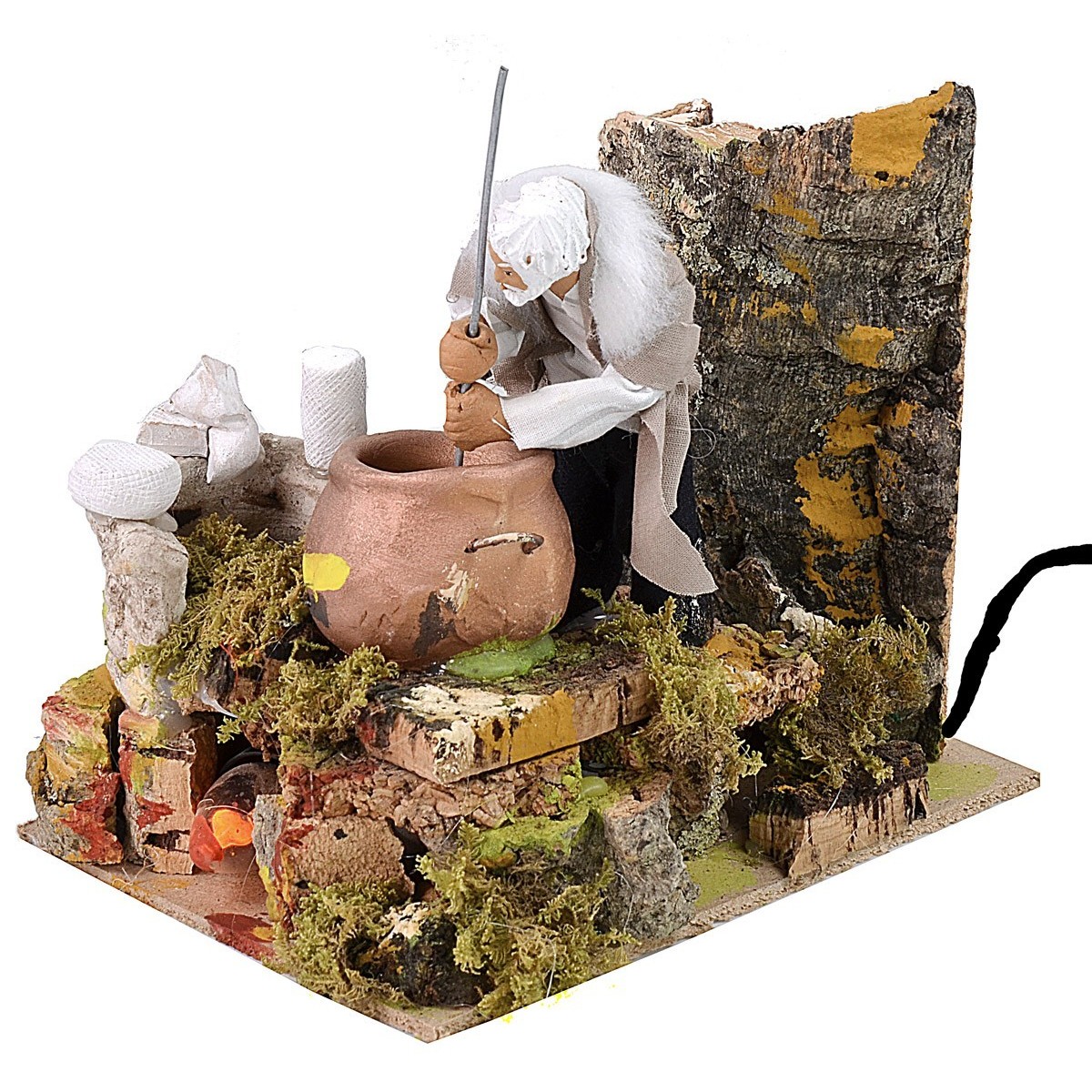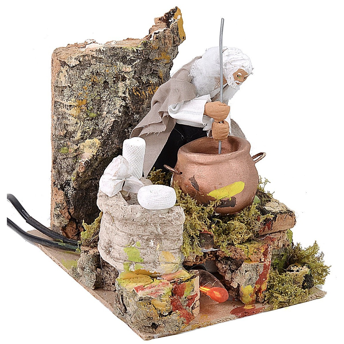 Quesero en movimiento que mueve el torso para mezclar en la cacerola, realizado en terracota por manos artesanas italianas con efecto de fuego funcionando con corriente. La escena está cuidada y rica en detalles como, por ejemplo, un muro de ladrillos y otros quesos ya elaborados.