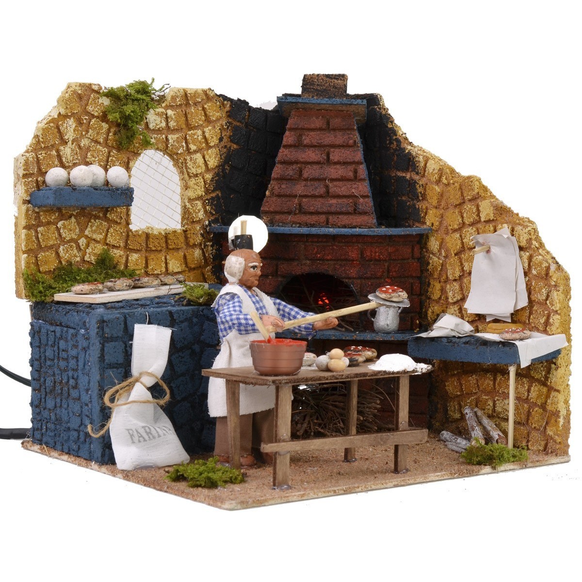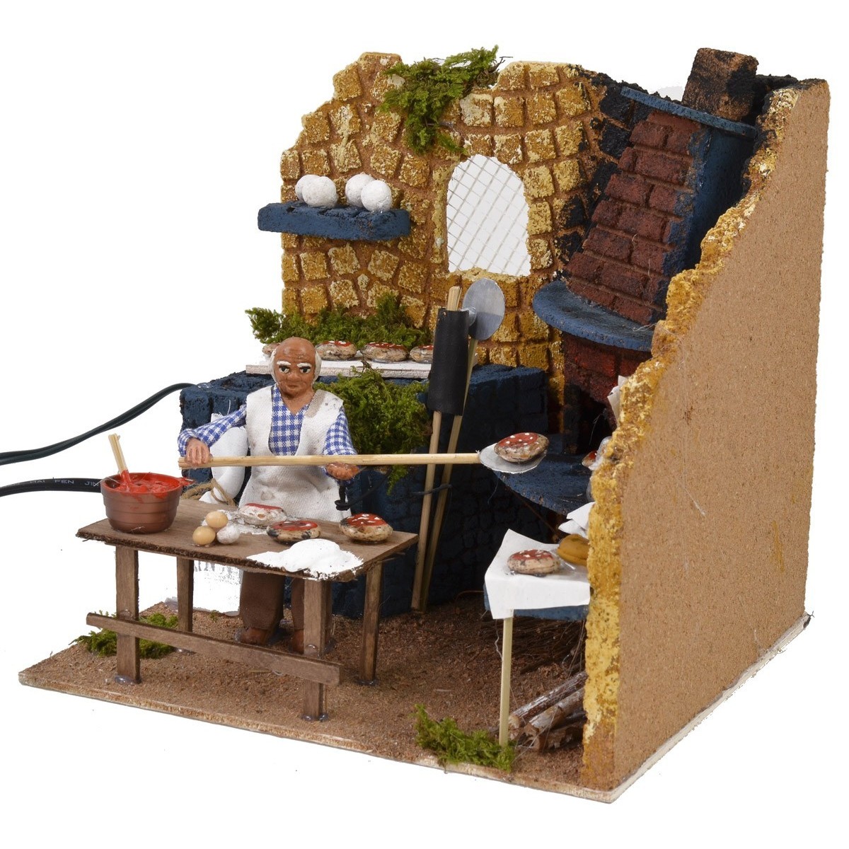 Escenografía para Belén que representa a un pizzero, de la serie de 10 cm, funcionando con corriente, realizado en terracota pintada a mano y vestido con ropa de tela. El sujeto gira el torso sosteniendo la pala, sobre la cual hay una pizza lista para hornear. Completa la escenografía un imponente horno que funciona con corriente con luz parpadeante efecto fuego. La estatua para el Belén está realizada en Italia por hábiles manos artesanas y está bien acabada en los detalles: el personaje presenta un rostro muy expresivo y la escena se caracteriza por múltiples planos donde se colocan pizzas y masas. En primer plano, también hay un banco de trabajo. Las miniaturas que representan la comida están perfectamente realizadas y son muy realistas. Además, se recuerda que el artículo está equipado con doble toma para los dos movimientos. Excelente producto para hacer único y original su Belén.