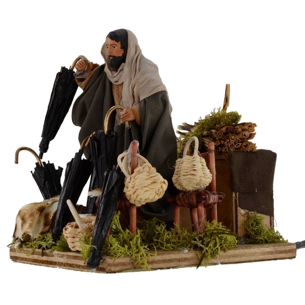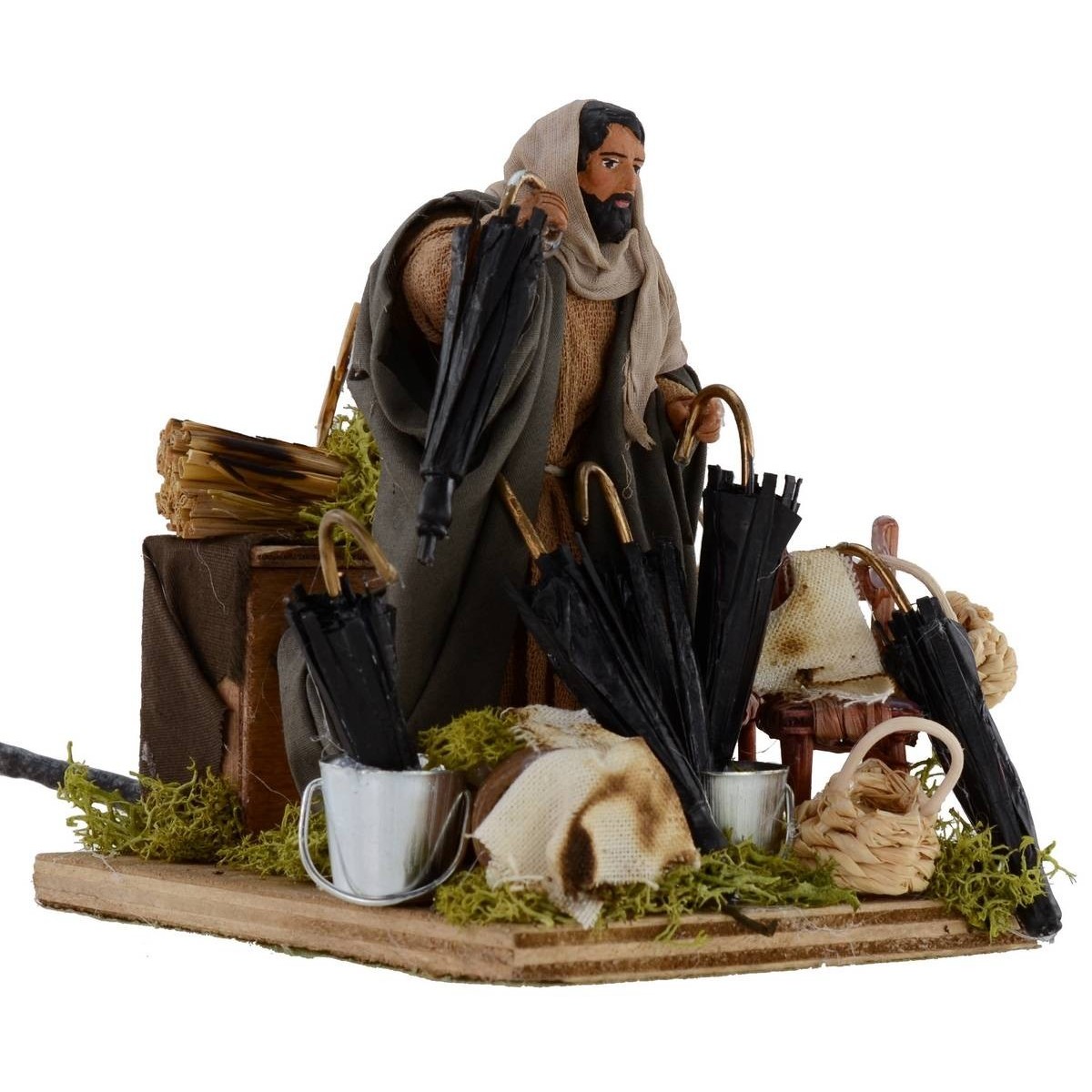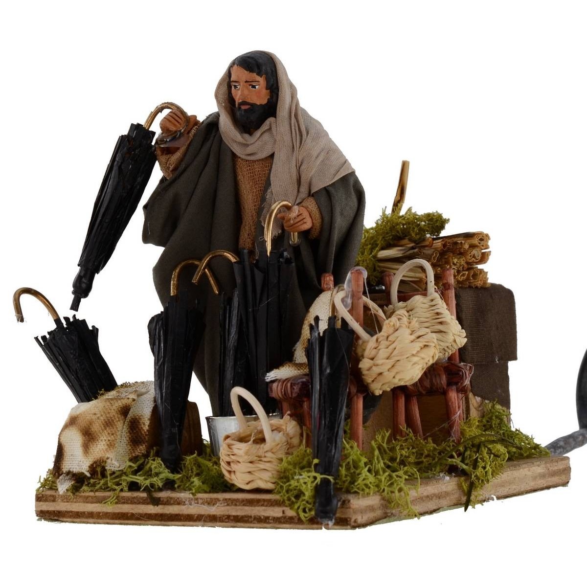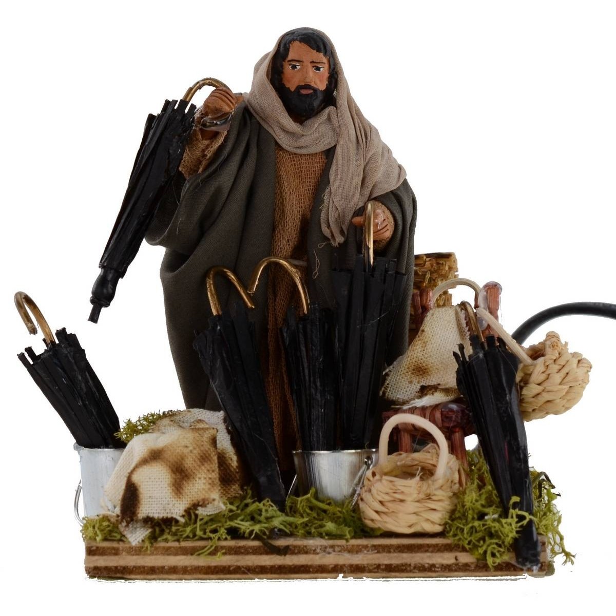 Vendedor de paraguas en movimiento. La escena es muy rica en detalles: en primer plano vemos al hombre, levantando y bajando un paraguas, que, gracias al movimiento del brazo, simula una invitación a comprar. Alrededor, colocados en el suelo, notamos la presencia de múltiples paraguas. Otros elementos característicos de la escena son la vegetación verde circundante, dos sillas, varios cubos, cestas de mimbre y un manojo de paja. La estatua está realizada en terracota y pintada a mano en Italia por hábiles manos artesanas con ropa de tela bien acabada. La estatua para el Belén clásico y/o napolitano mide 10 cm y se caracteriza por el uso de materiales como la madera, la tela y la terracota. Al ser productos realizados artesanalmente, las caras y la ropa de las estatuas pueden variar respecto a la foto.