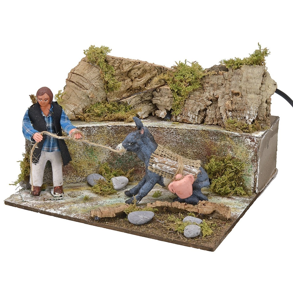 Campesino de 10 cm que tira del burro en movimiento, el cual lleva un cargamento de leña en la espalda con una ánfora. El escenario se reproduce en un sendero de montaña. La ambientación está realizada en madera, corcho con elementos naturales como rocas, musgo y piedras y puede ser enriquecida aún más con las miniaturas presentes en la categoría dedicada. La estatua es de terracota y está bien acabada con ropas de tela. Al ser un producto artesanal, se precisa que los colores de la ropa y la cara pueden variar respecto a la foto. Este producto está realizado enteramente a mano por artesanos italianos. Este artículo funciona con corriente.
