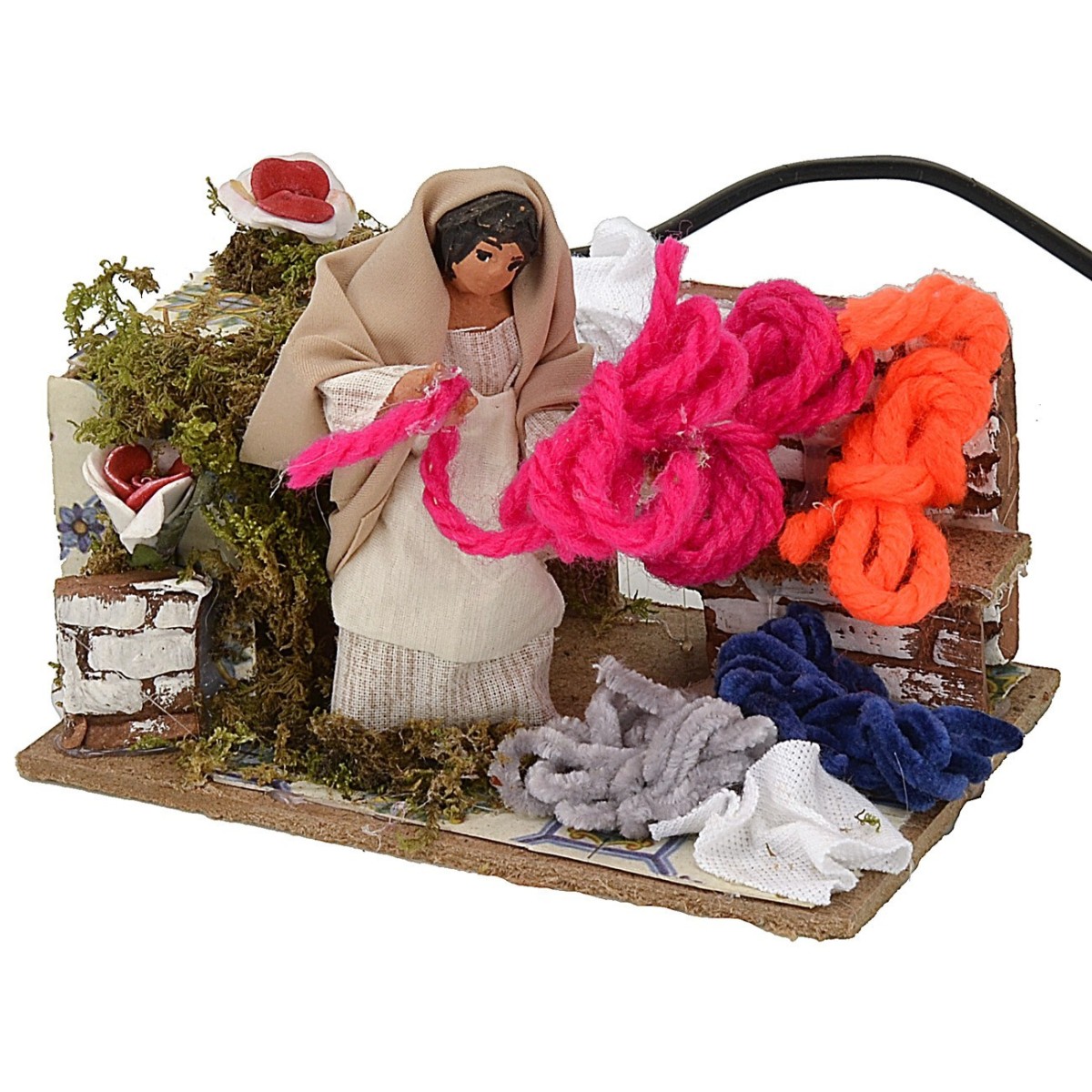 Vendedora de ovillos de lana con movimiento, la comerciante mueve el torso simulando una invitación a los clientes a comprar. La estatua es de terracota con ropa de tela, los colores de la ropa y del rostro pueden variar respecto a la foto. Producto realizado completamente a mano por artesanos italianos en corcho de madera, musgo y terracota. El producto funciona con corriente.