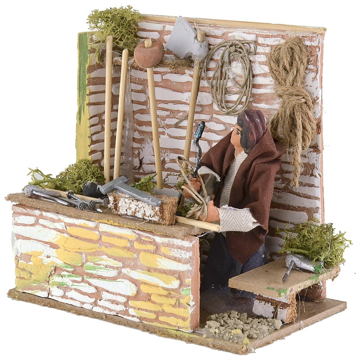 Carpintero para belén en movimiento de altura 10 cm. El hombre, gracias al movimiento rotatorio del brazo, simula la acción de taladrar. En la ambientación hay mechones de vegetación, un banco con herramientas de trabajo (clavos, martillo, etc.) y otras miniaturas colgadas en la pared. La estatua es de terracota con ropa de tela, los colores de la vestimenta y del rostro pueden variar respecto a la foto. El artículo funciona con corriente y ha sido realizado completamente a mano por artesanos italianos con madera, corcho y terracota. En los productos relacionados debajo de la tabla hay accesorios para el belén útiles para enriquecer aún más la escena.
