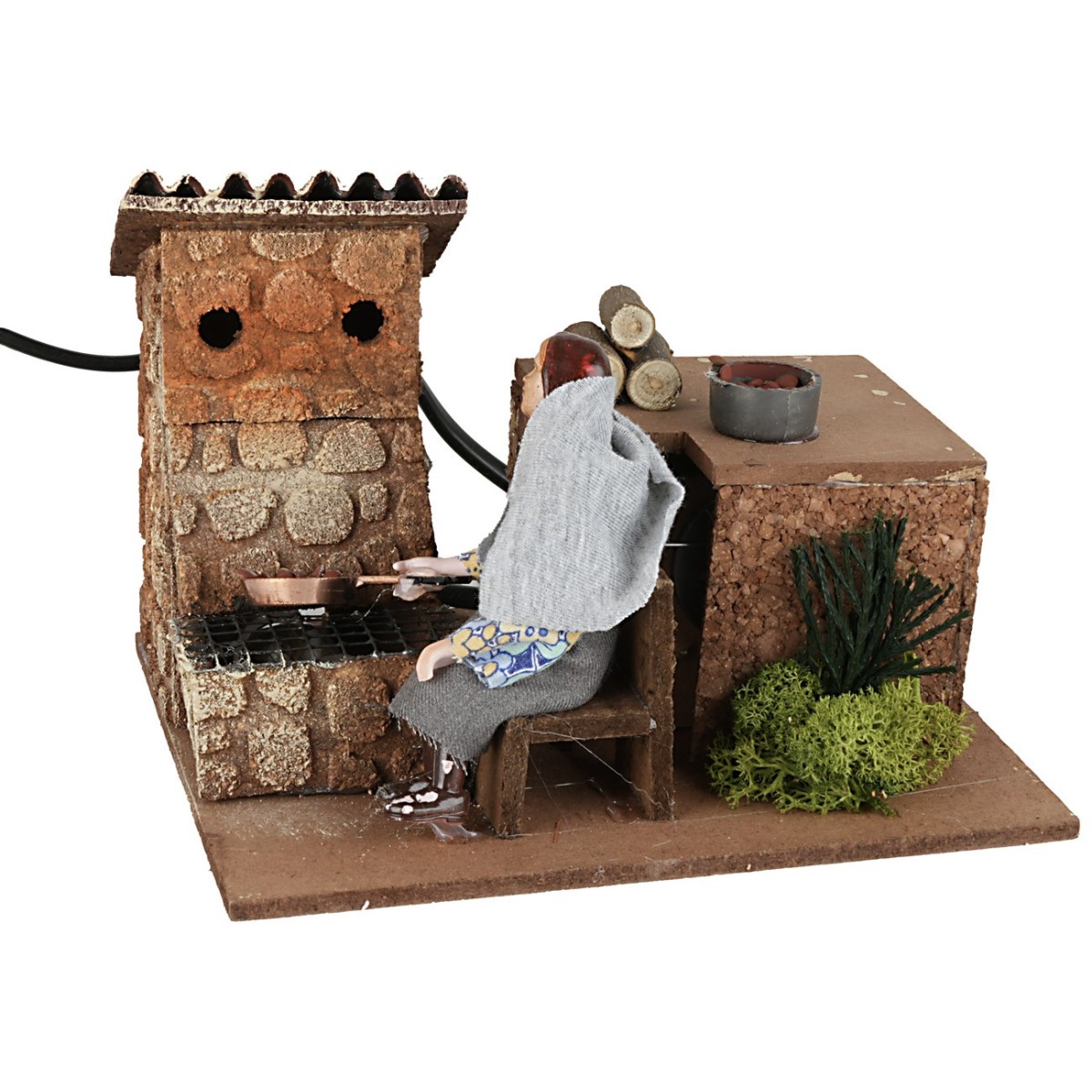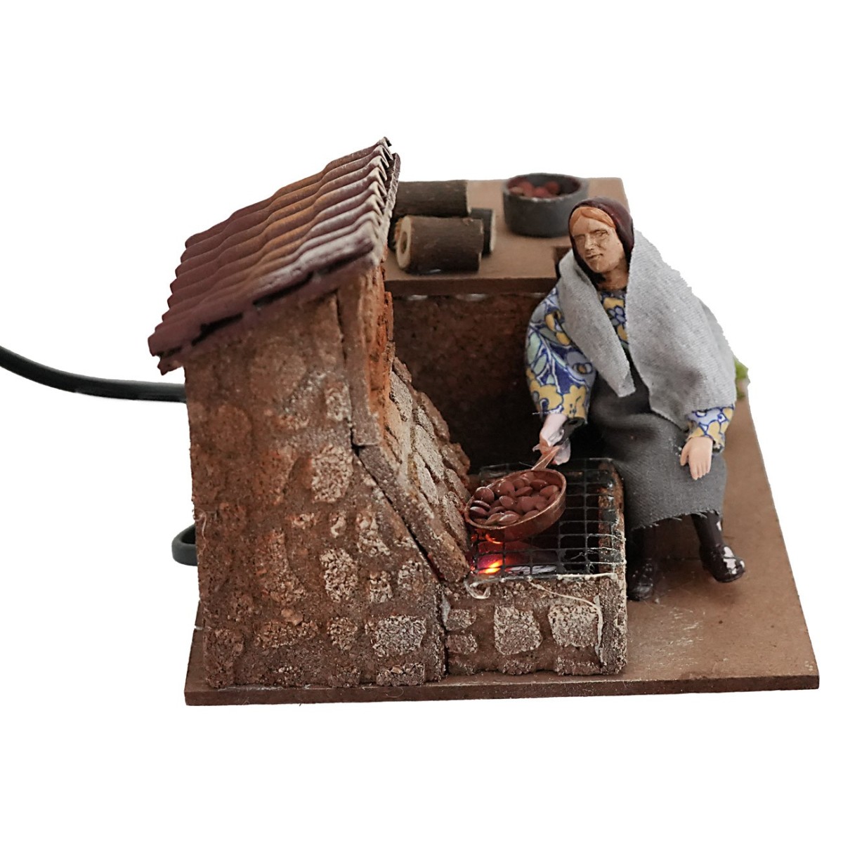 Mujer sentada en movimiento que está asando las castañas en el fuego completo con luz de efecto llama que funciona con corriente. La escena está hecha artesanalmente en Italia y está bien acabada en los detalles con la estatua vestida con ropa de tela. El producto ha sido realizado en madera, corcho y musgo.