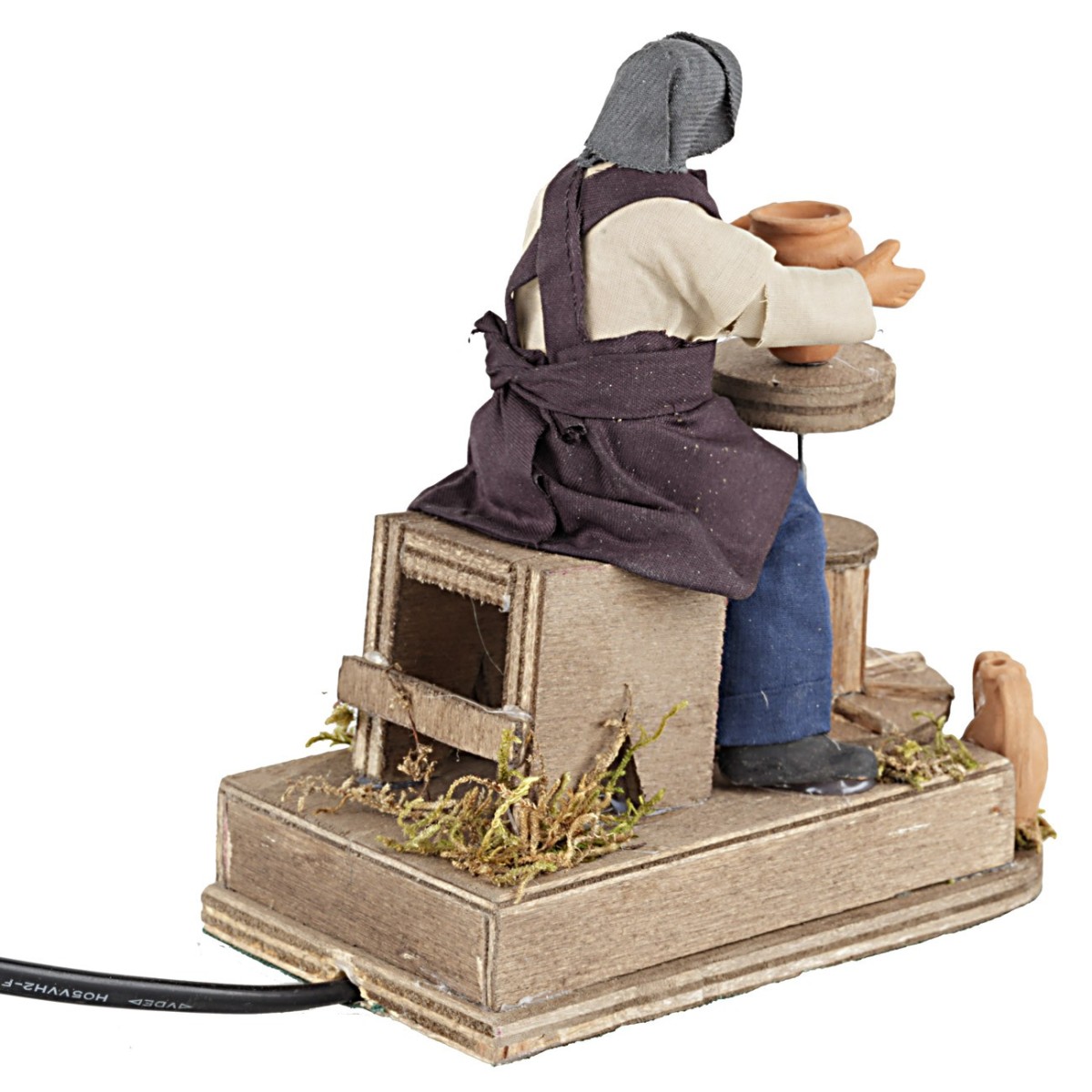 Ceramista de serie 12 cm, con el movimiento del pie imita la acción de trabajar la terracota sobre una base de madera decorada con musgo. La figurita está realizada en terracota y pintada a mano en Italia por hábiles manos artesanas con ropas de tela bien acabadas. La figura para el Belén clásico y/o napolitano que mide realmente 13 cm, está realizada en terracota y es funcional con corriente. Se precisa que los detalles del producto pueden variar ya que se realiza artesanalmente.