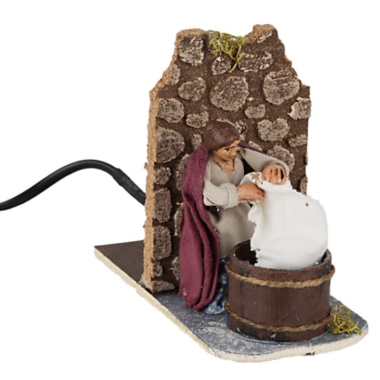 Mujer que, con el movimiento del torso, imita la acción de lavar la ropa en el cubo. La estatua es de terracota con ropa de tela, los colores de las vestimentas y del rostro pueden variar respecto a la foto. Producto realizado enteramente a mano por artesanos italianos en madera de corcho, musgo y terracota. El producto funciona con corriente.