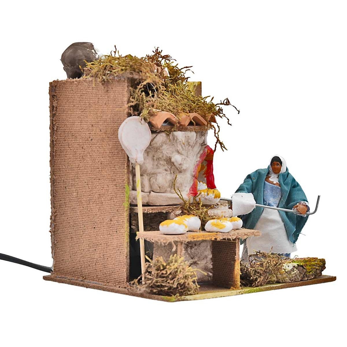 Mujer serie de 12 cm que, con el movimiento del brazo, simula la acción de regar las plantas. La figurita está hecha de terracota y pintada a mano por artesanos italianos y vestida con ropa de tela. Perfecta para un belén clásico o napolitano, la figura funciona con corriente eléctrica. La escenografía que la acompaña está construida con madera, corcho, musgo y terracota, creando un ambiente tradicional y sugestivo. Se especifica que los detalles del producto pueden variar, garantizando la unicidad de cada pieza ya que está hecha a mano.