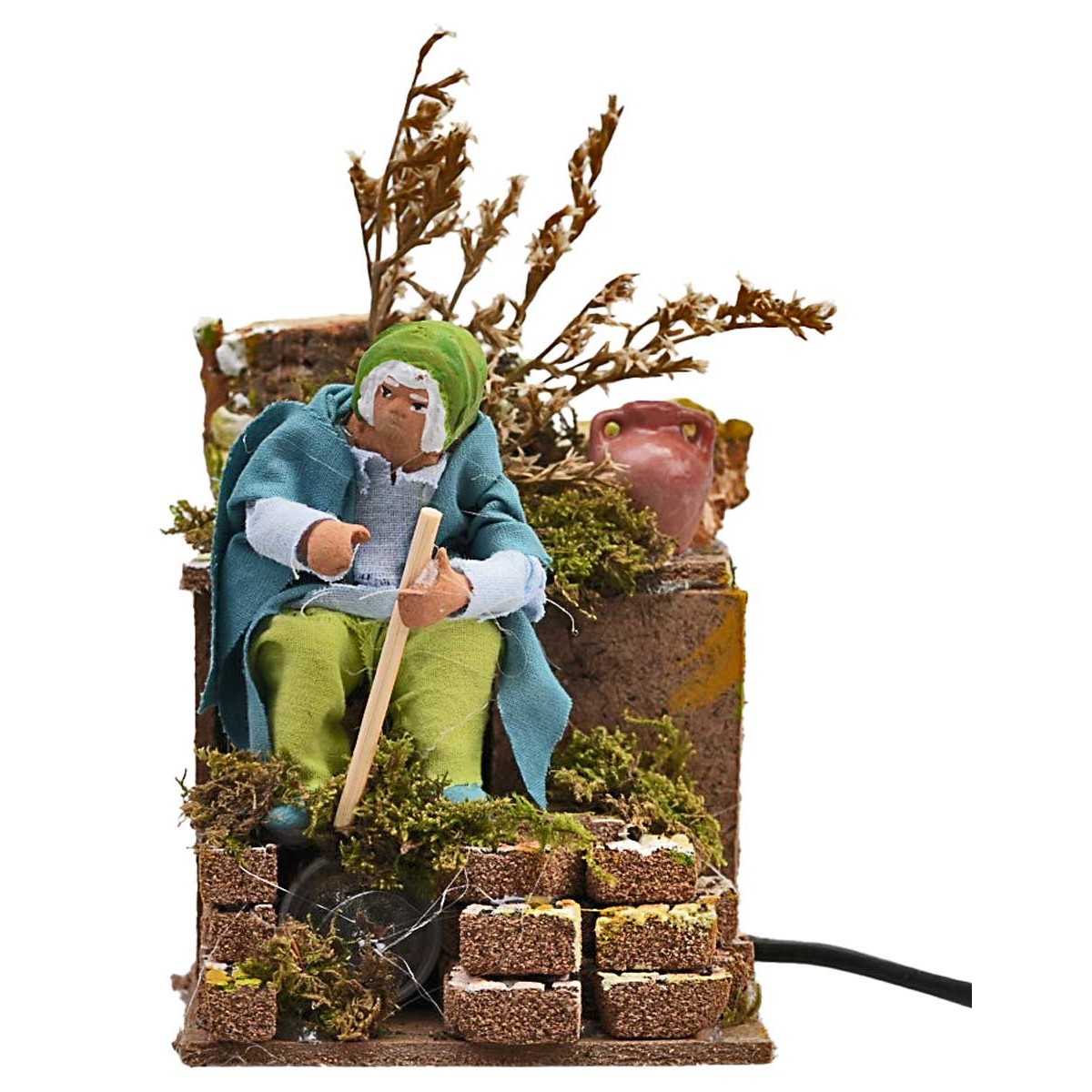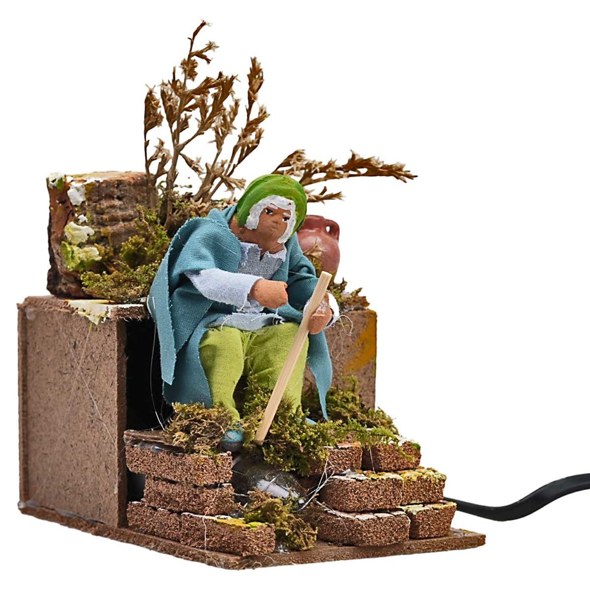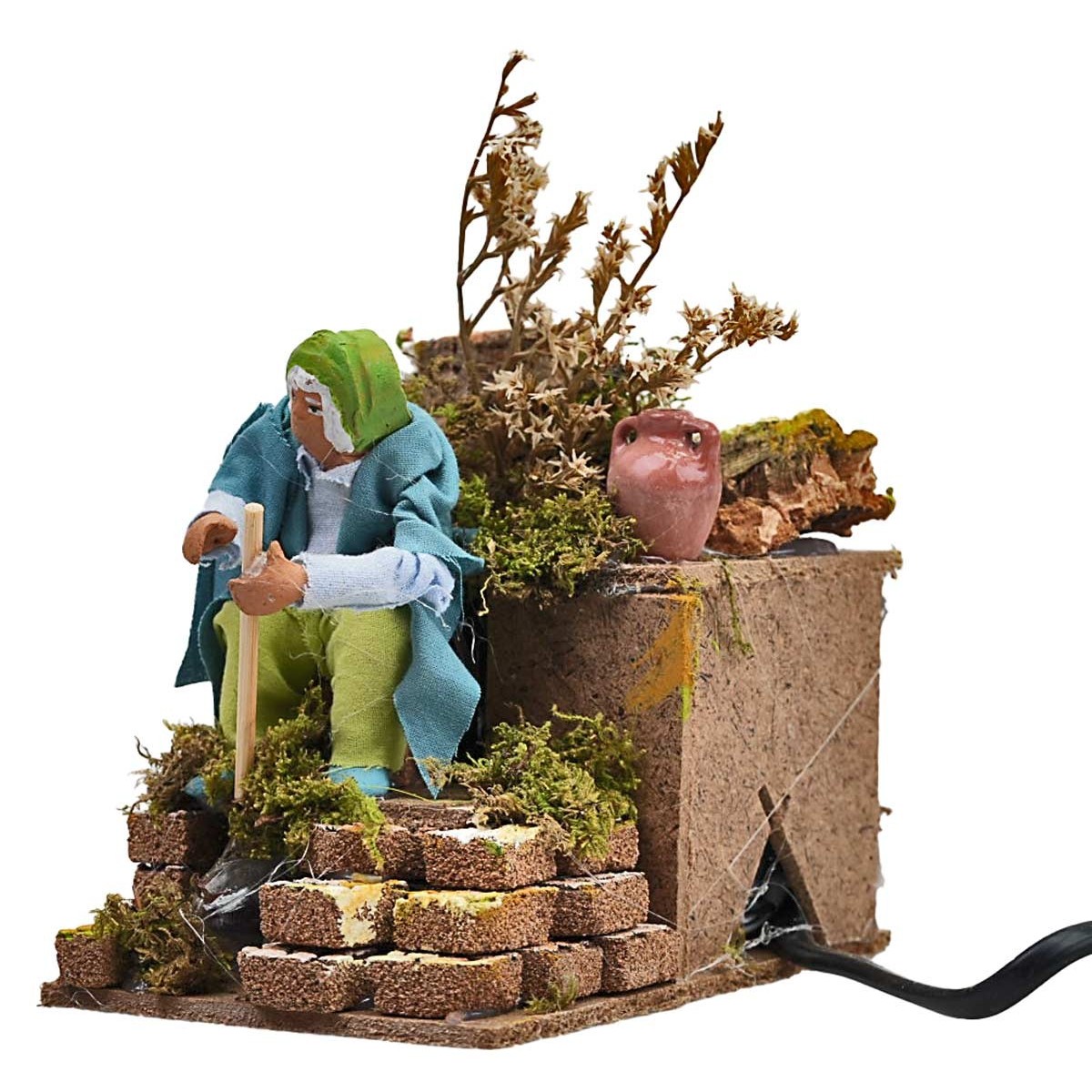 Mujer serie de 12 cm que, con el movimiento del brazo, simula la acción de regar las plantas. La figurita está hecha de terracota y pintada a mano por artesanos italianos y vestida con ropa de tela. Perfecta para un belén clásico o napolitano, la figura funciona con corriente eléctrica. La escenografía que la acompaña está construida con madera, corcho, musgo y terracota, creando un ambiente tradicional y sugestivo. Se especifica que los detalles del producto pueden variar, garantizando la unicidad de cada pieza ya que está hecha a mano.