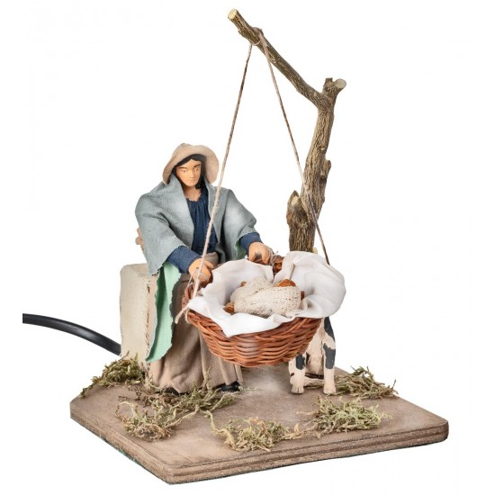 Madre con niño en la cesta en movimiento. La escena representa a una madre, vestida con ropa larga, junto a una cesta suspendida de una rama robusta. En el interior, el niño yace vestido y cubierto por un paño blanco. La cesta está hecha de madera y adornada con pequeños detalles como un cesto con toallas de colores y musgo verde. La figurita es de terracota, pintada a mano en Italia por artesanos expertos, con ropa de tela bien acabada. Ideal para el belén clásico y napolitano, funciona con corriente. Detalles como colores y miniaturas pueden variar, siendo un producto artesanal único.