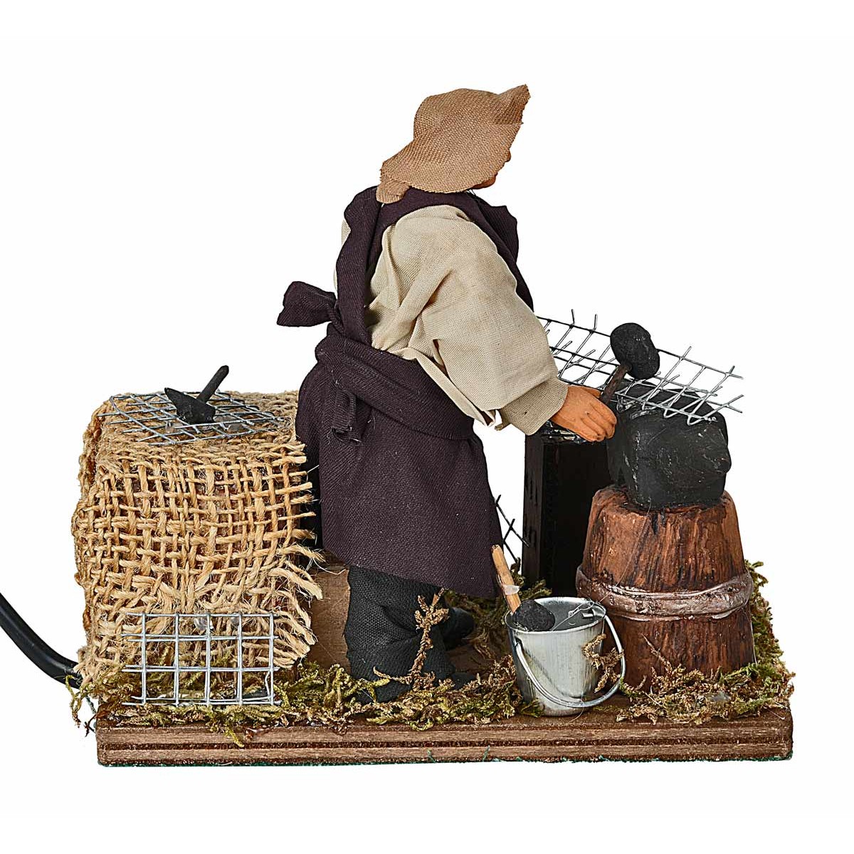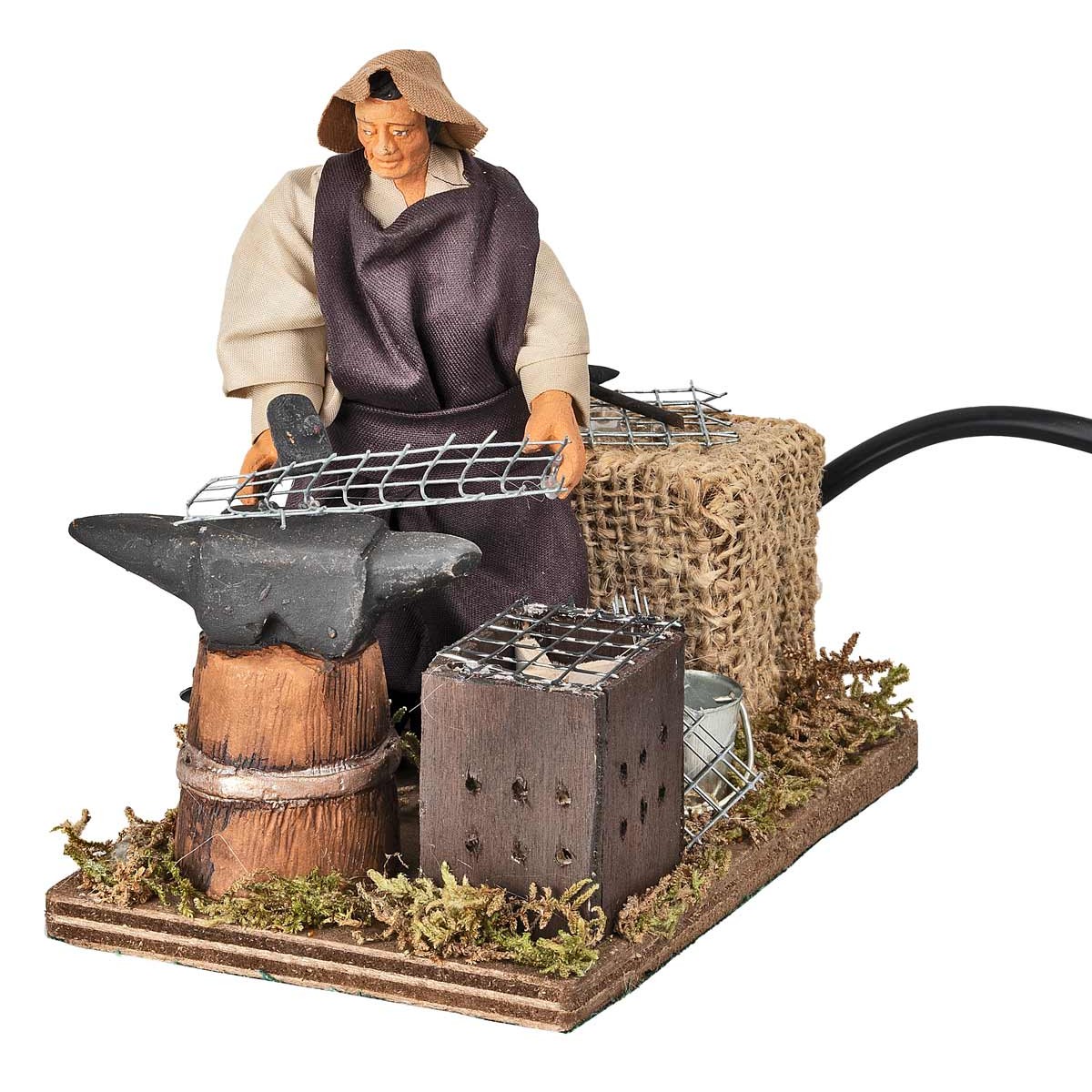 Herrero trabajando en movimiento. La escena representa a un herrero con delantal marrón chocolate, camisa y tocado beige, mientras empuña una red y un martillo, simulando la acción de martillar. Los detalles incluyen un barril que sostiene el yunque, un pequeño horno de madera y redes de metal esparcidas. La escenografía, realizada en madera, corcho, musgo y terracota, crea un ambiente tradicional y sugerente. Los detalles pueden variar, garantizando la unicidad de cada pieza artesanal.