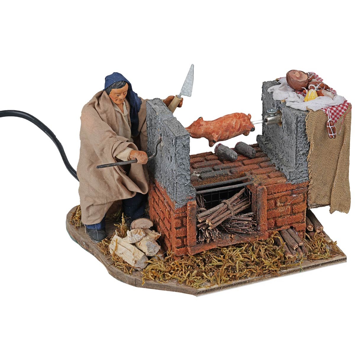 Hombre que gira el cerdo asado, una escena compuesta por una estructura que simula una pequeña parrilla hecha de ladrillos rojos en relieve, con luz roja que simula el fuego de la parrilla. El cerdo ensartado gira alrededor, gracias al movimiento del brazo del hombre. La escenografía está enriquecida con madera, corcho, musgo y terracota, creando una atmósfera tradicional y sugestiva. Se precisa que los detalles del producto pueden variar, garantizando la unicidad de cada pieza, ya que está hecha a mano.