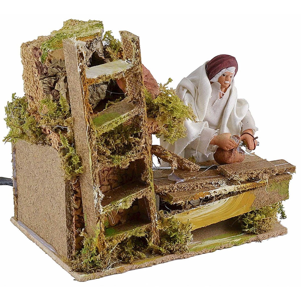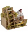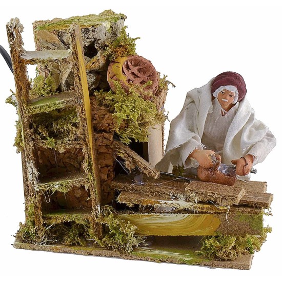 Artesano que cepilla la madera en movimiento de altura 10 cm. El carpintero, gracias al movimiento lateral de los brazos simula el lijado. En la ambientación están presentes mechones de vegetación y una escalera. La estatua es de terracota con ropa de tela, los colores de las vestimentas y del rostro pueden variar respecto a la foto. Producto realizado enteramente a mano por artesanos italianos en madera, corcho, musgo y terracota. El artículo funciona con corriente. En los productos relacionados visibles debajo de la tabla hay otros accesorios para enriquecer aún más la escena.