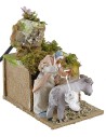 Aldeana en movimiento de altura 10 cm con burro. La mujer, gracias al movimiento del torso arriba y abajo, simula la acción de cargar al animal. En el escenario para el pesebre hay mechones de vegetación. La estatua es de terracota con ropa de tela, los colores de las vestimentas y del rostro pueden variar respecto a la foto. El artículo funciona con corriente y ha sido realizado completamente a mano por artesanos italianos con madera, corcho y terracota.
