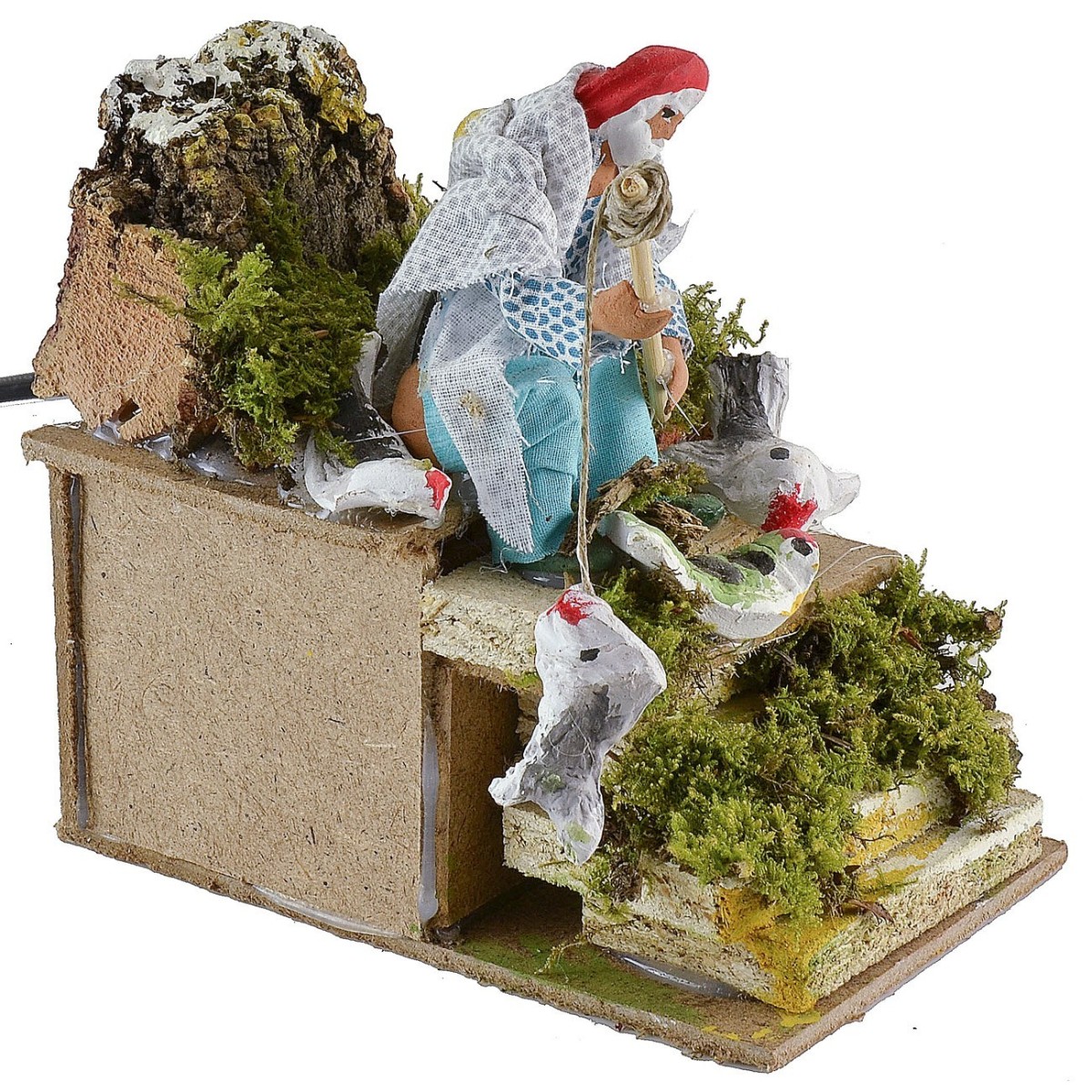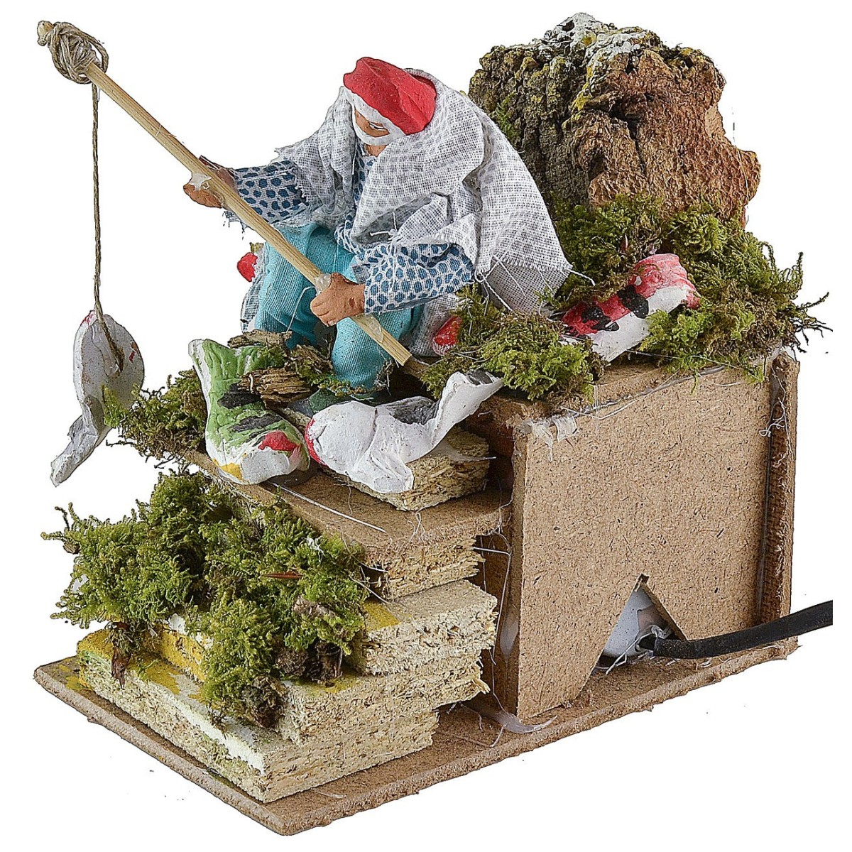 Hombre que pesca en movimiento de altura 10 cm. El pescador, gracias al movimiento del torso hacia arriba y hacia abajo, simula la acción de pescar. En la ambientación hay mechones de musgo, rocas de corcho y varios tipos de peces. La estatua es de terracota con ropa de tela, los colores de la ropa y del rostro pueden variar respecto a la foto. Producto realizado completamente a mano por artesanos italianos en madera, corcho, musgo y terracota. El artículo funciona con corriente eléctrica. En los productos relacionados visibles debajo de la tabla hay accesorios adicionales para enriquecer aún más la escena.
