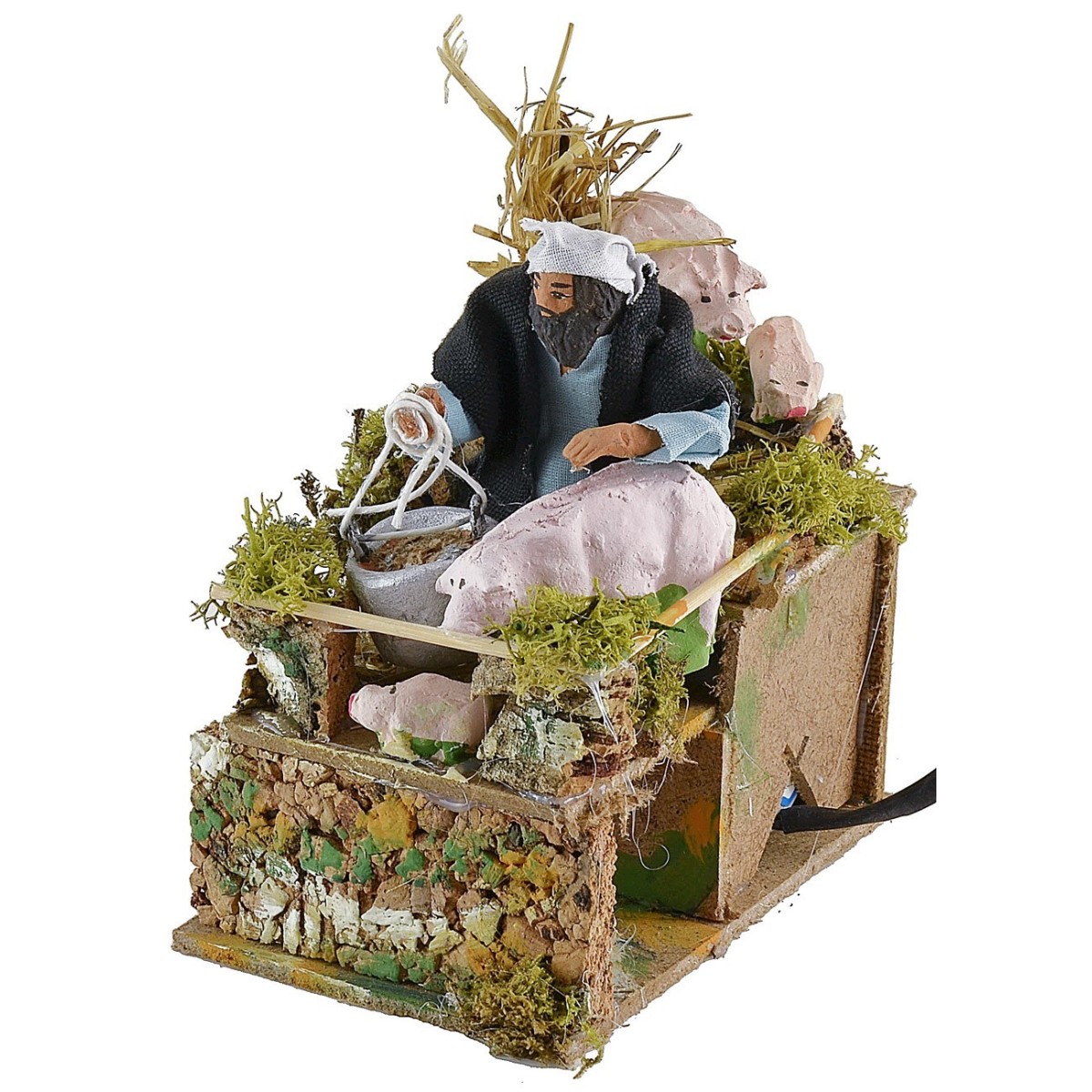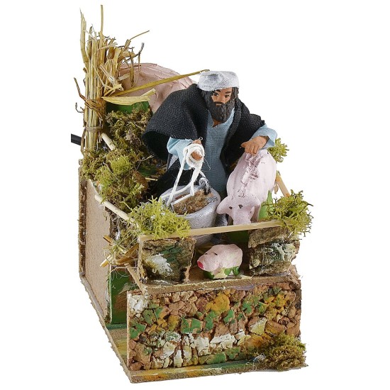 Campesino que cría cerdos en movimiento de altura 10 cm. El hombre, gracias al movimiento del brazo hacia arriba y hacia abajo, simula la acción de alimentar al animal. En la ambientación para el belén hay mechones de vegetación. La estatua es de terracota con ropas de tela, los colores de la ropa y del rostro pueden variar respecto a la foto. El artículo funciona con corriente y ha sido realizado completamente a mano por artesanos italianos con madera, corcho y terracota.