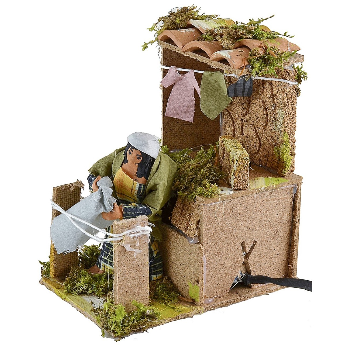 Mujer en el tendedero en movimiento de altura 10 cm. La ama de casa gracias al movimiento del torso hacia arriba y abajo simula la acción de colgar la ropa a secar. En la ambientación para el pesebre hay mechones de vegetación. La estatua es de terracota con ropa de tela, los colores de las vestimentas y del rostro pueden variar respecto a la foto. El artículo funciona con corriente y ha sido realizado completamente a mano por artesanos italianos con madera, corcho y terracota.