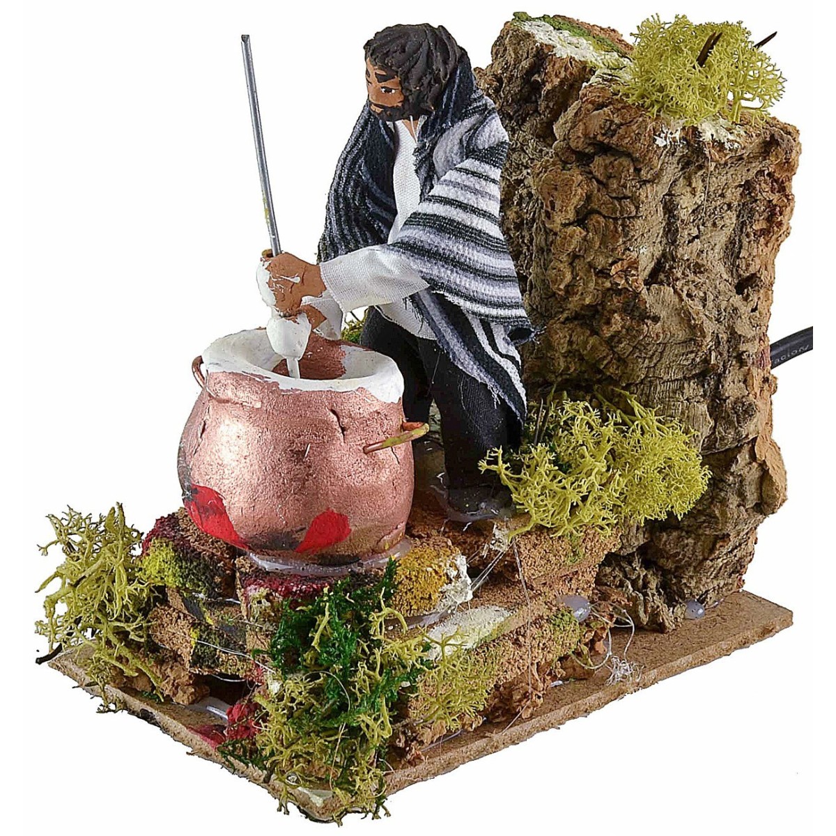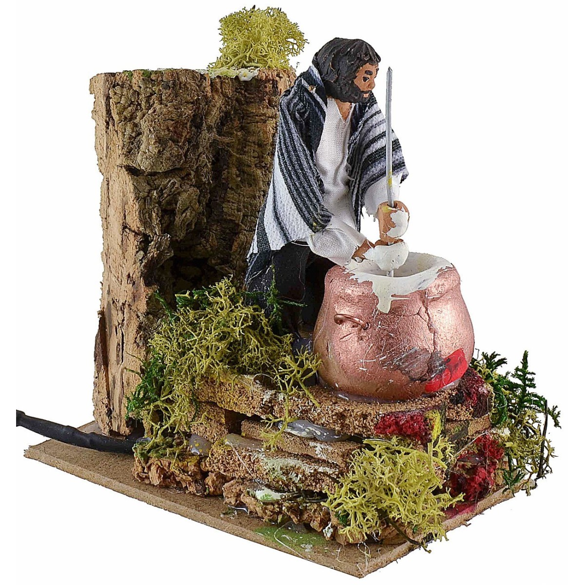 Pastor que prepara el queso en movimiento de altura 10 cm. El quesero, gracias al movimiento circular de los brazos, simula la acción de mezclar. En el escenario hay mechones de vegetación y rocas de corcho. La estatua es de terracota con ropa de tela, los colores de la ropa y del rostro pueden variar respecto a la foto. Producto realizado enteramente a mano por artesanos italianos en madera de corcho, musgo y terracota. El artículo funciona con corriente eléctrica. En los productos relacionados visibles debajo de la tabla hay accesorios adicionales para enriquecer aún más la escena.