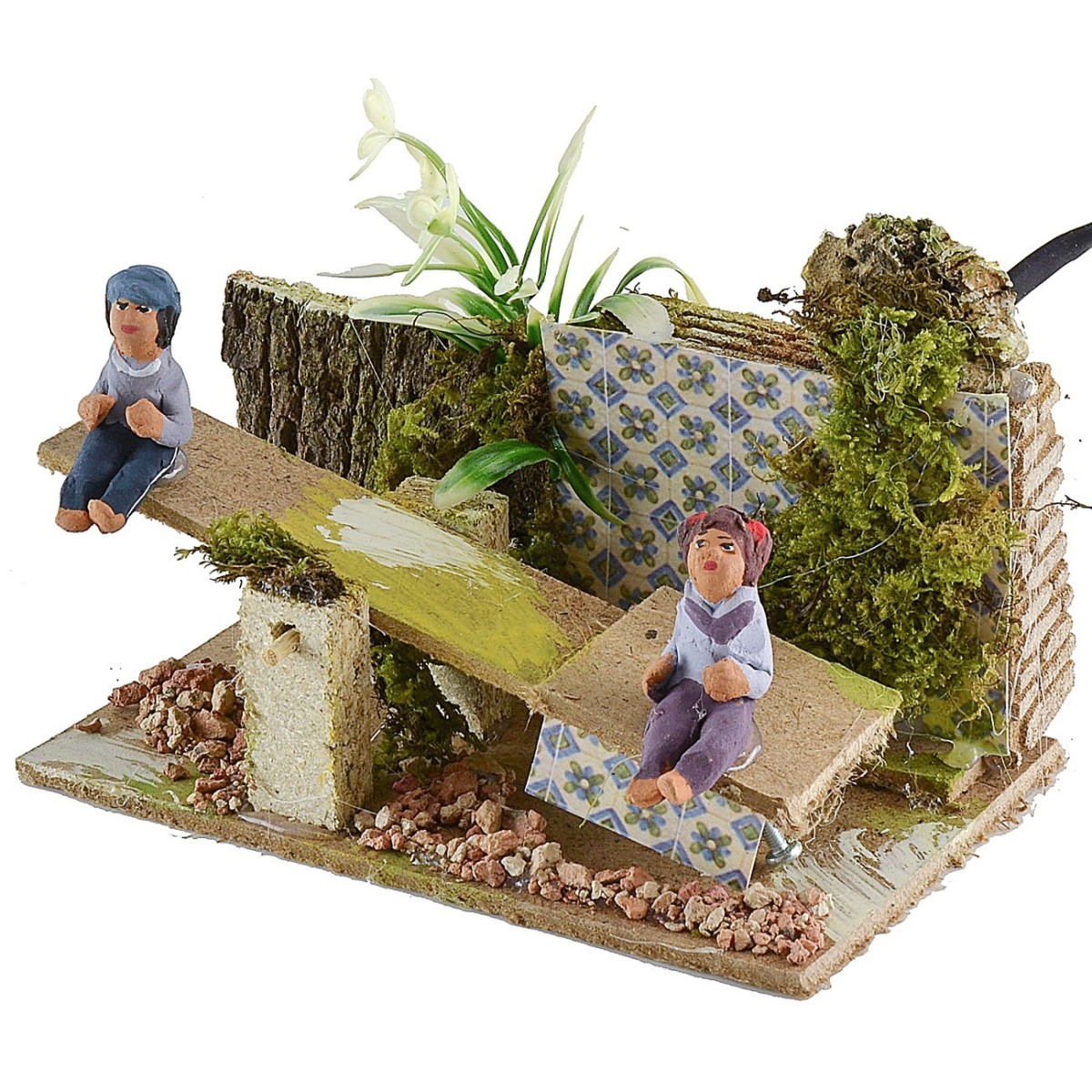 Niños en columpio en movimiento serie 10 cm. Los niños simulan el balanceo gracias al movimiento hacia arriba y hacia abajo del eje. En la ambientación para el belén hay mechones de vegetación. La estatua es de terracota con ropa de tela, los colores de las vestimentas y del rostro pueden variar respecto a la foto. El artículo funciona con corriente y ha sido realizado completamente a mano por artesanos italianos con madera, corcho y terracota.
