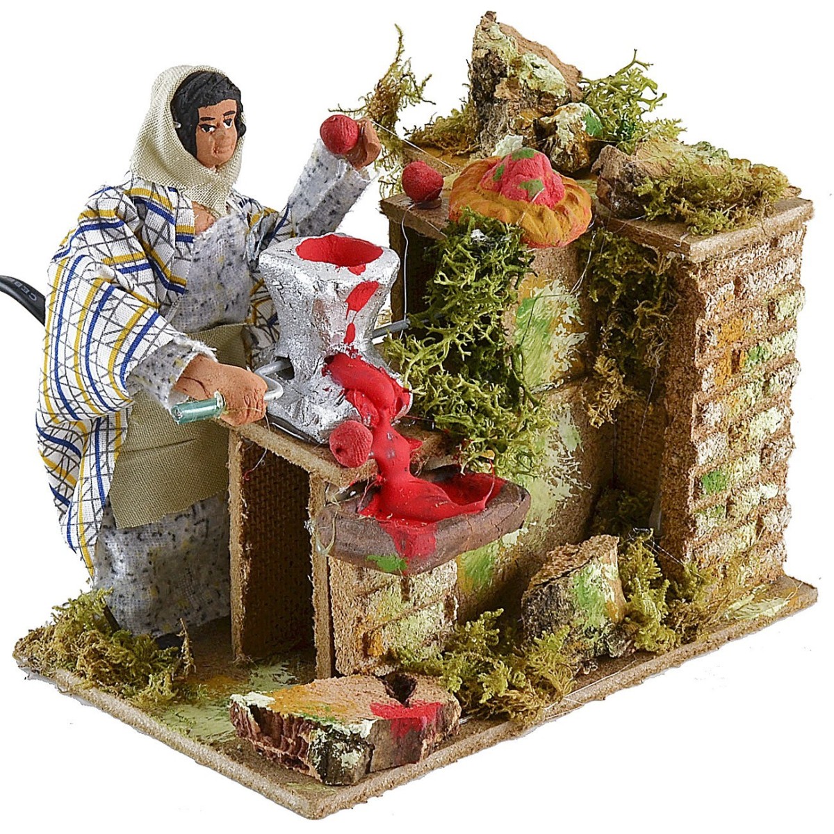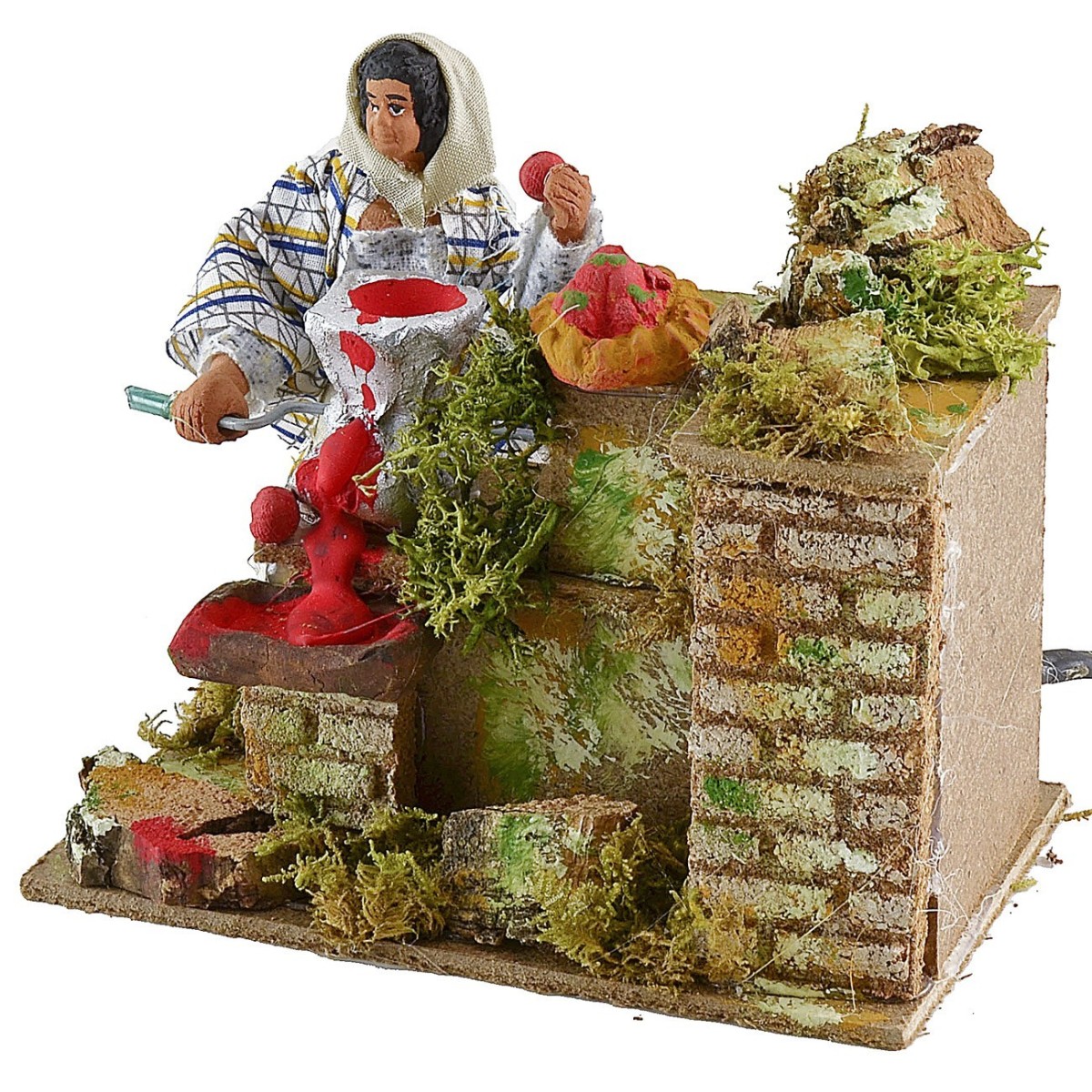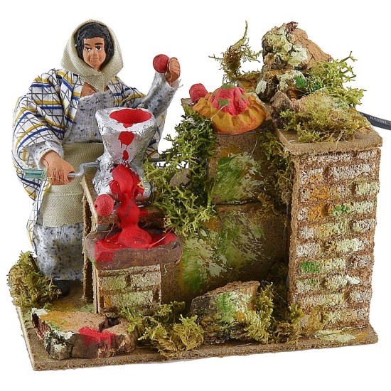Ama de casa que exprime los tomates en movimiento de altura de 10 cm. La mujer, gracias al movimiento del brazo hacia adelante y hacia atrás, simula la acción de pasar los tomates en el triturador. En la ambientación para el pesebre hay mechones de vegetación. La estatua es de terracota con ropas de tela, los colores de la ropa y del rostro pueden variar respecto a la foto. El artículo funciona con corriente y ha sido realizado completamente a mano por artesanos italianos con madera, corcho y terracota.