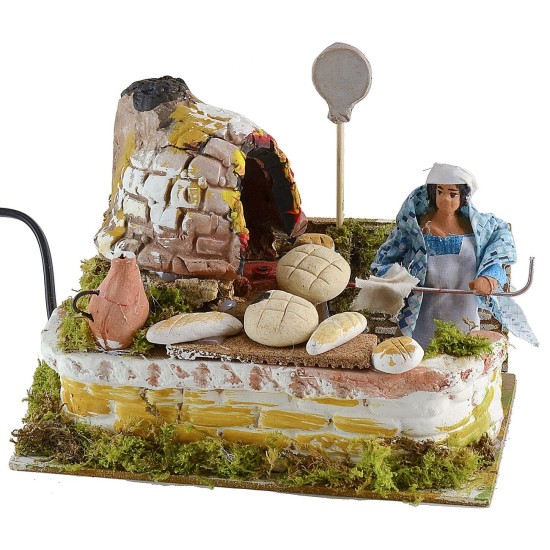 Panadera en movimiento de altura 12 cm. La mujer, gracias al movimiento rotatorio interno del horno con luz funcionando, simula la acción de hornear el pan colocado en la pala. En la ambientación para belén hay mechones de vegetación. La estatua es de terracota con ropa de tela, los colores de la ropa y del rostro pueden variar respecto a la foto. El artículo funciona con corriente y ha sido realizado completamente a mano por artesanos italianos con madera, corcho y terracota.