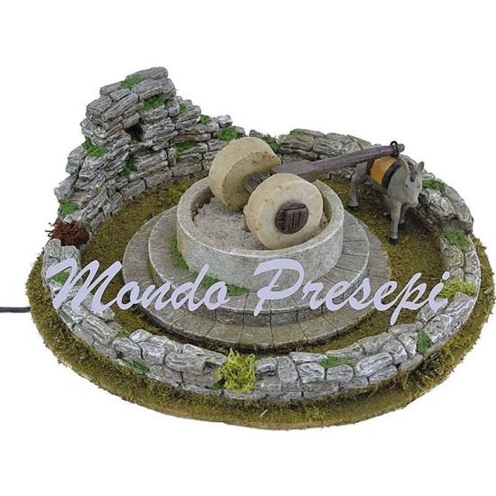 Escena en resina con burro y molino en movimiento, las ruedas giran y rozan sobre la harina molida.