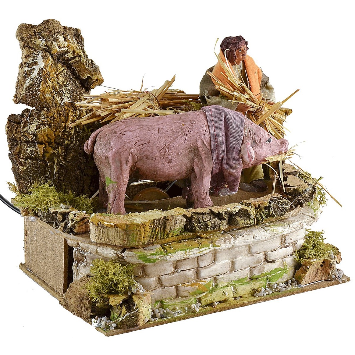 Campesinos con cerdo de doble movimiento de altura 12 cm. El hombre, gracias al movimiento del torso, simula la acción de alimentar al cerdo, mientras que este último mueve la cabeza. En el escenario para el belén hay mechones de vegetación. La estatua es de terracota con ropa de tela, los colores de la ropa y del rostro pueden variar con respecto a la foto. El artículo funciona con corriente y ha sido realizado completamente a mano por artesanos italianos con madera, corcho y terracota.