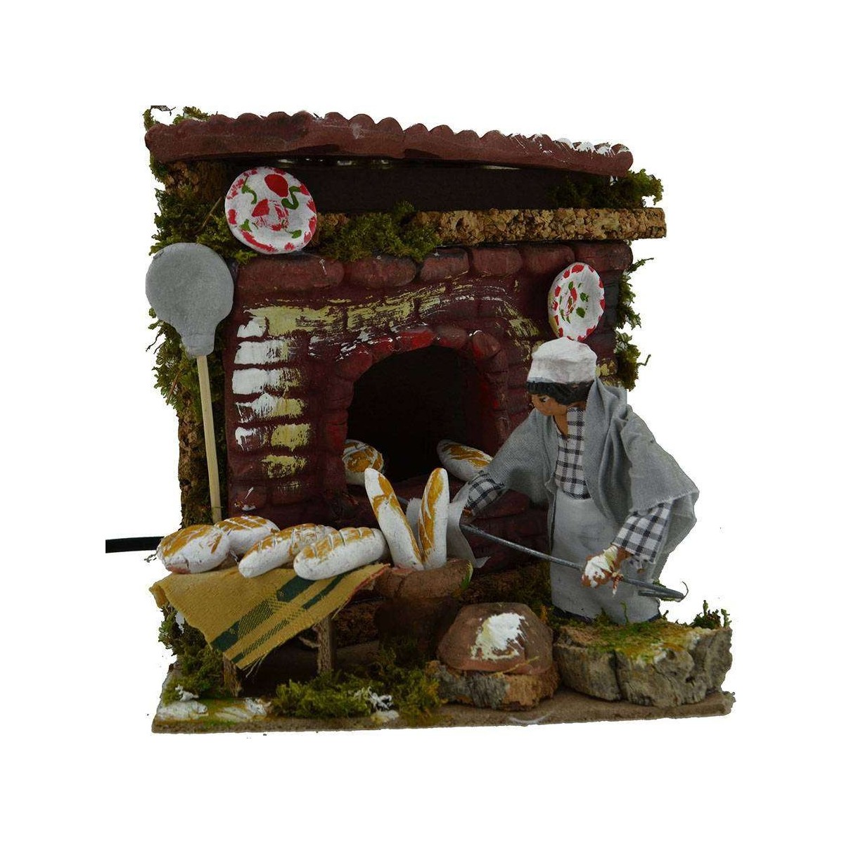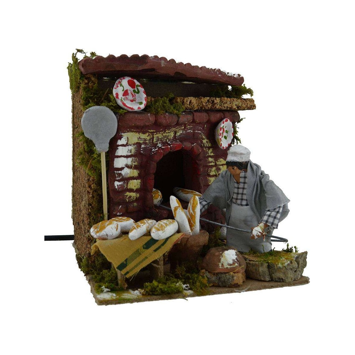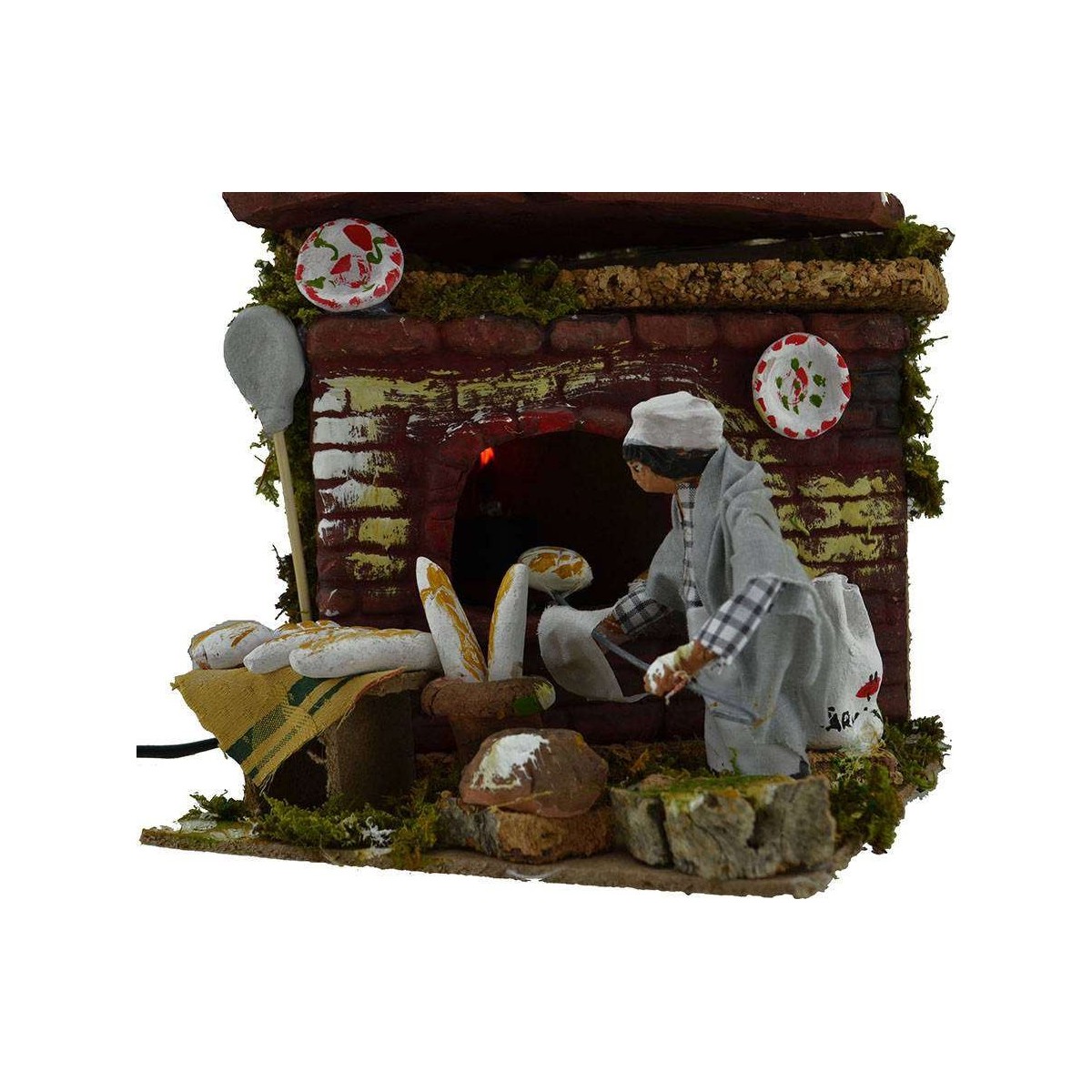 Panadero de 10 cm en terracota con ropa de tela que hornea el pan en el horno con lámpara efecto fuego, todo funcionando con corriente.