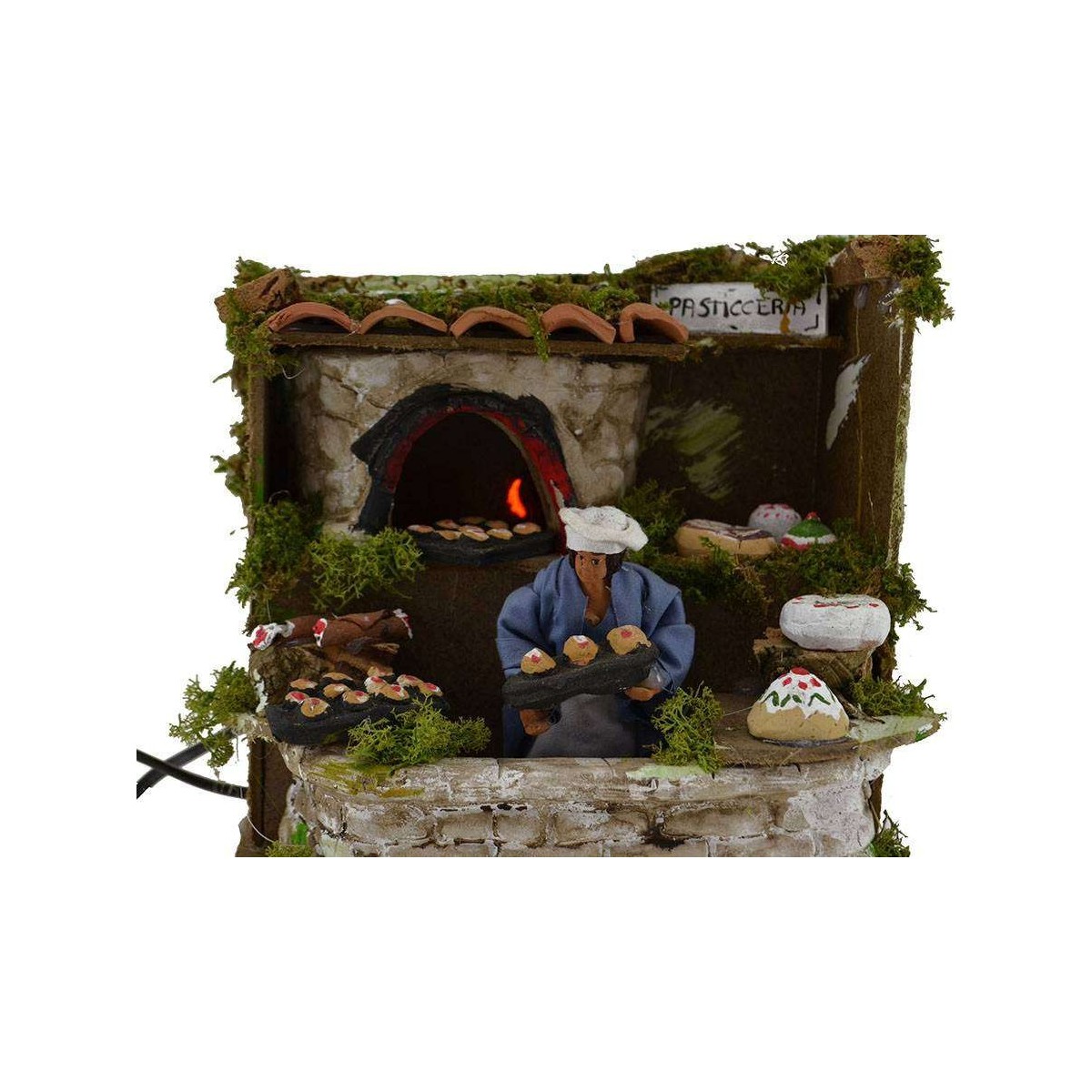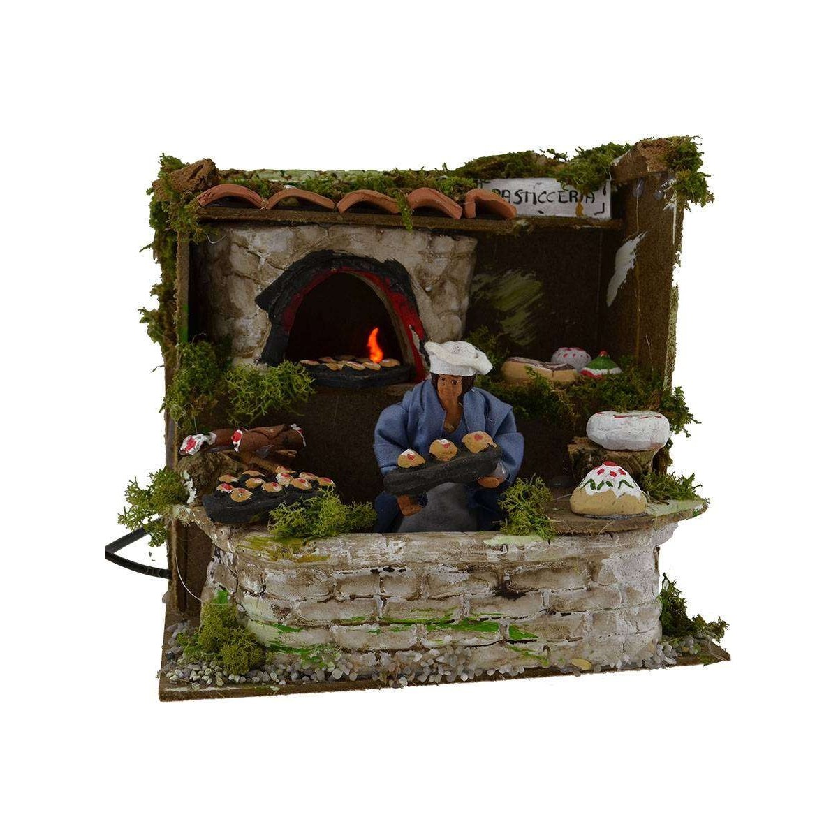 Pastelero en movimiento, en terracota con ropa de tela, mueve la bandeja de pasteles, horno con efecto de fuego todo funcionando con corriente.