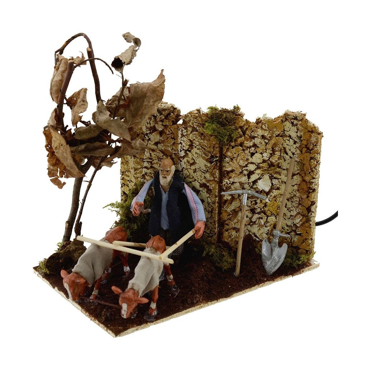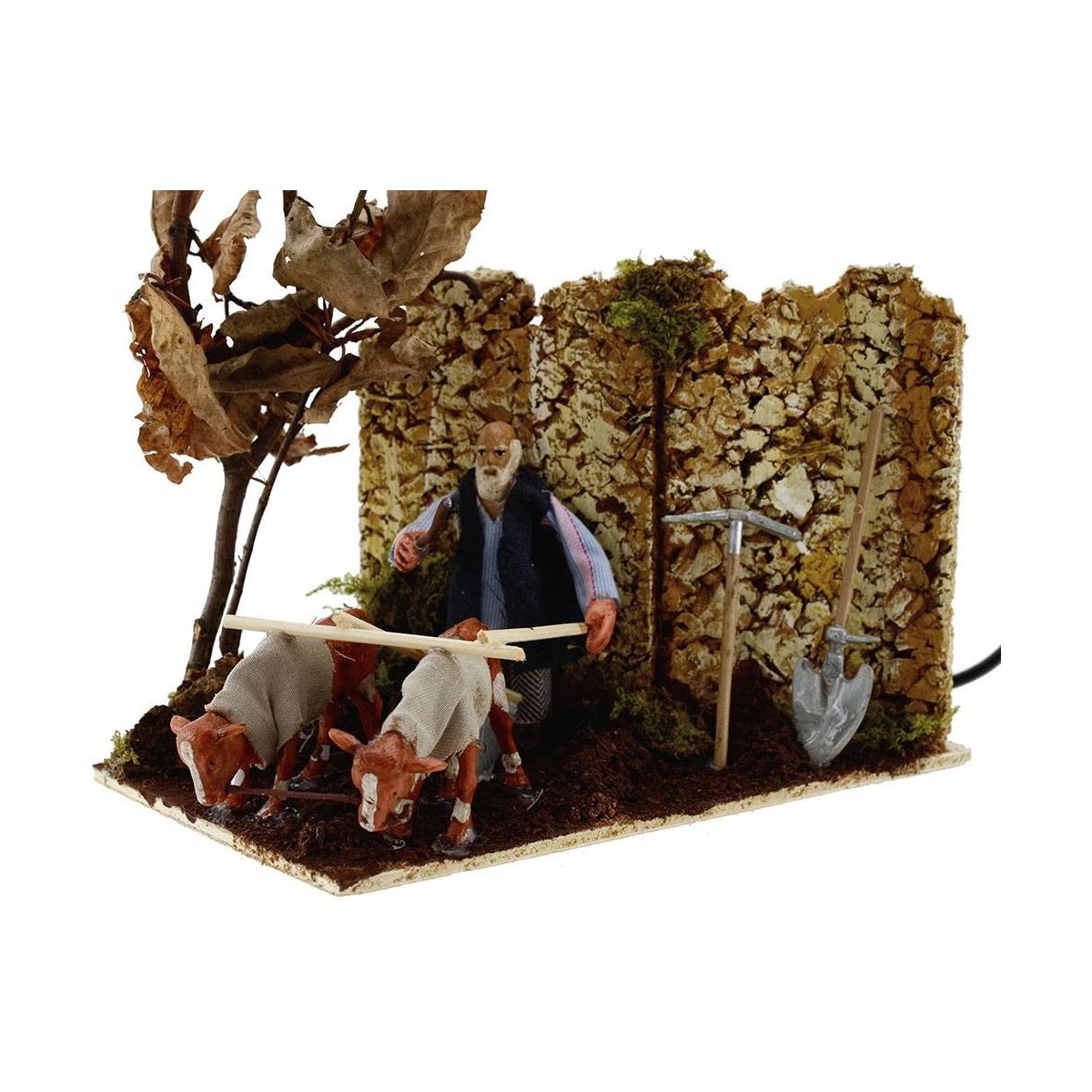 Campesino que sube y baja el bastón con los 2 bueyes que mueven la cabeza, funcionando con corriente. Estatua en movimiento para belén realizada en terracota vestida con tela, altura de las estatuas 8 cm. Al ser artículos realizados completamente a mano, los colores de la ropa y algunos pequeños detalles pueden variar respecto a la foto del producto.