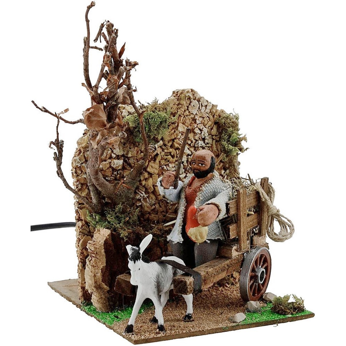 Carretero en movimiento levanta y baja el brazo con la fusta, funcionando con corriente. Estatua en movimiento para belén realizada en terracota vestida con tela, altura de las estatuas 8 cm. Al ser artículos realizados enteramente a mano, los colores de la ropa y algunos pequeños detalles pueden variar respecto a la foto del producto.