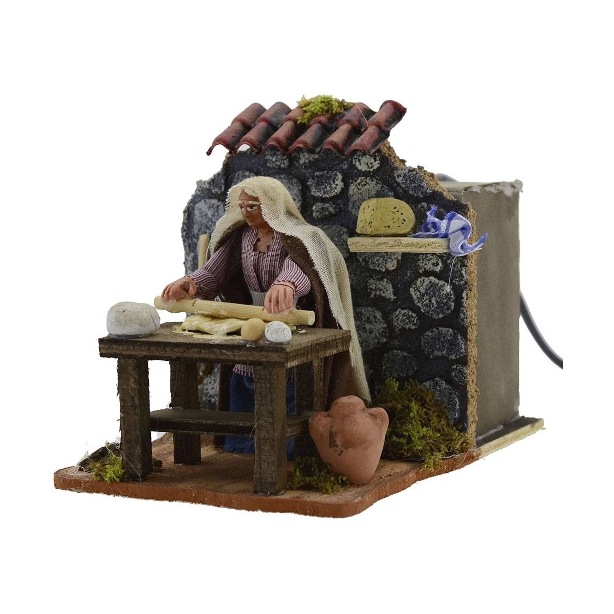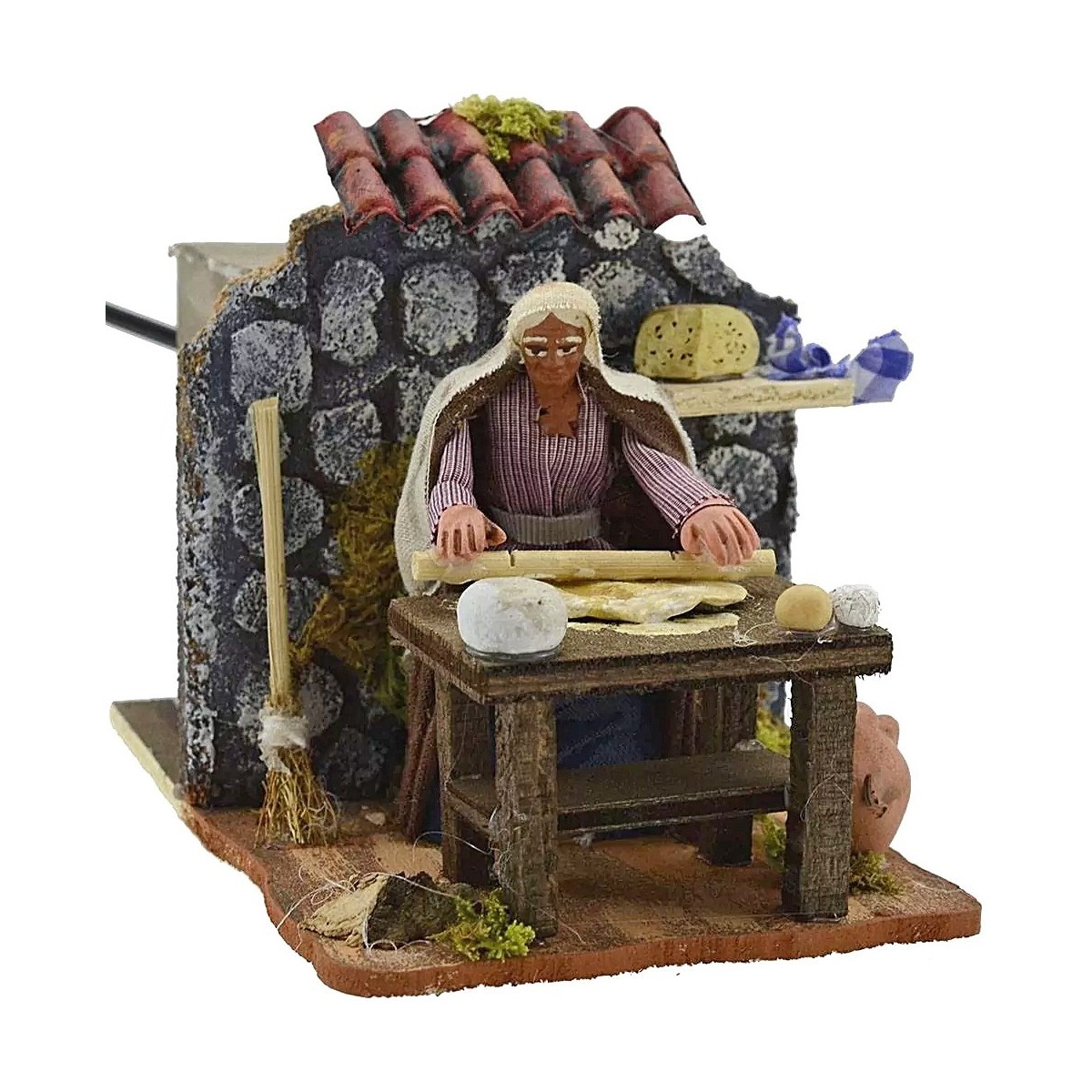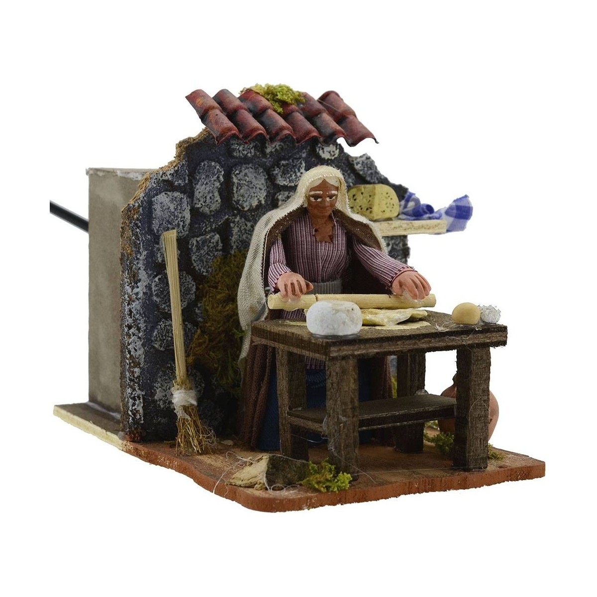 Amasadora en movimiento que extiende la masa, estatua de terracota vestida con tela, los colores de la ropa de la estatua pueden variar ligeramente con respecto a la foto ya que están hechos completamente a mano.