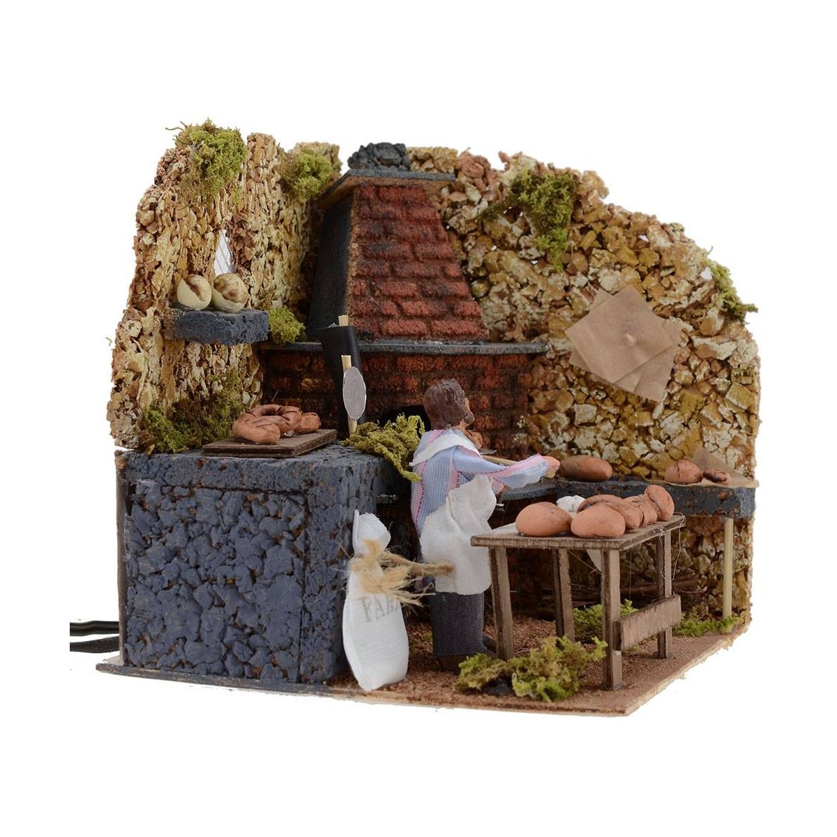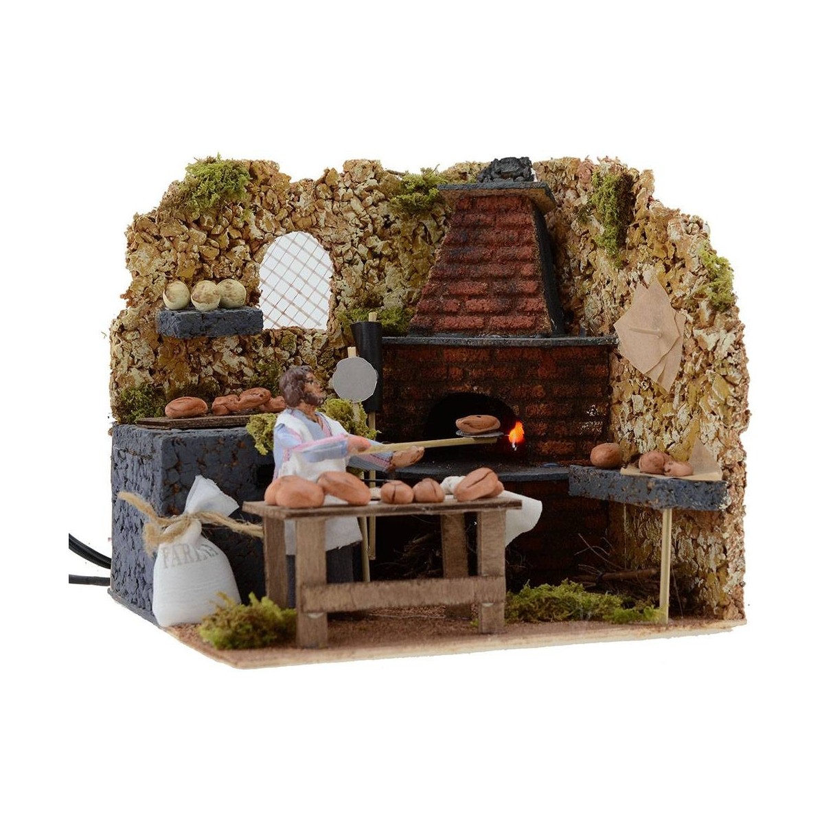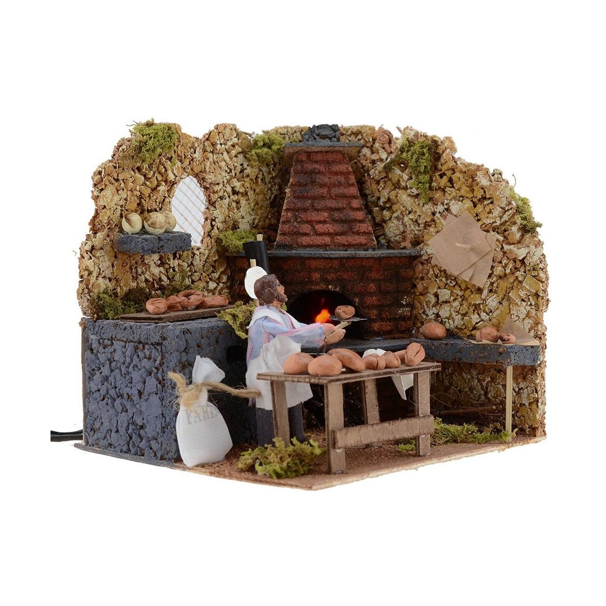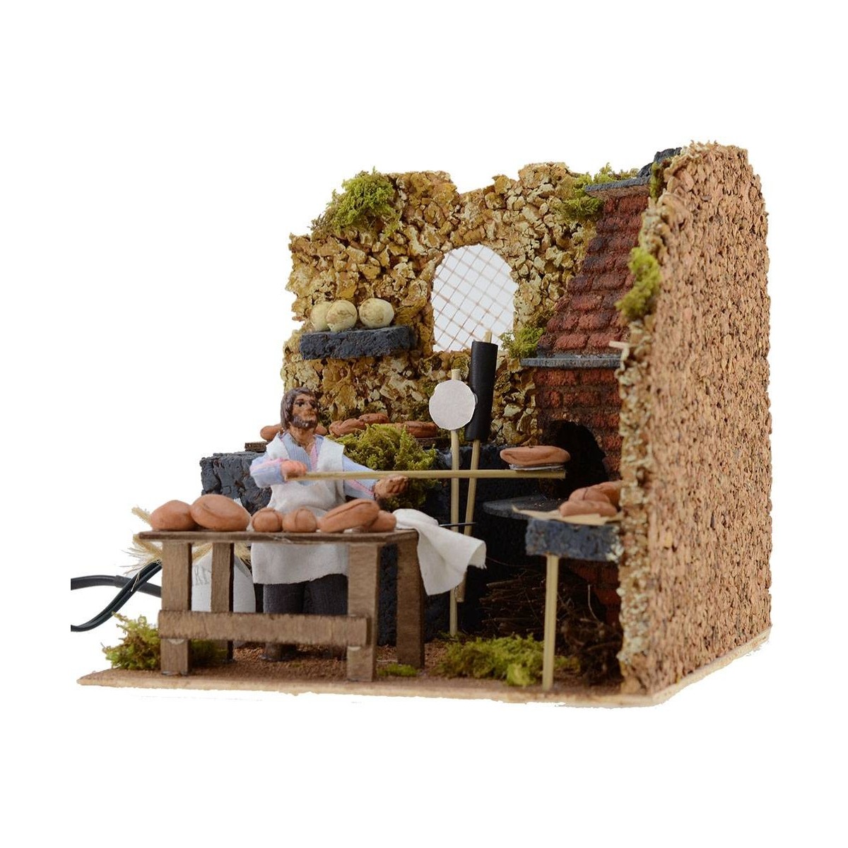 Panadero en movimiento que saca el pan recién horneado, el horno tiene un efecto realista dado por la luz efecto llama; la estatua es de terracota y vestida con tela. Esta escena está realizada completamente a mano en Italia, de hecho, está muy definida en los detalles: el horno en ángulo tiene 3 niveles, en el inferior hay haces de leña, tanto a la derecha como a la izquierda del fuego se pueden ver estantes con hogazas de pan, absolutamente indispensables para enfatizar la escena y hacer inmediata la percepción de quien la observa. En primer plano se coloca la mesa de madera donde se trabaja el pan, justo detrás está la estatua que sostiene la pala con la que hornea el pan; la estatua está adornada a la izquierda con un saco blanco de harina y a la derecha con un par de palas. Al fondo, una ventana con reja deja entrever un vistazo de su belén.