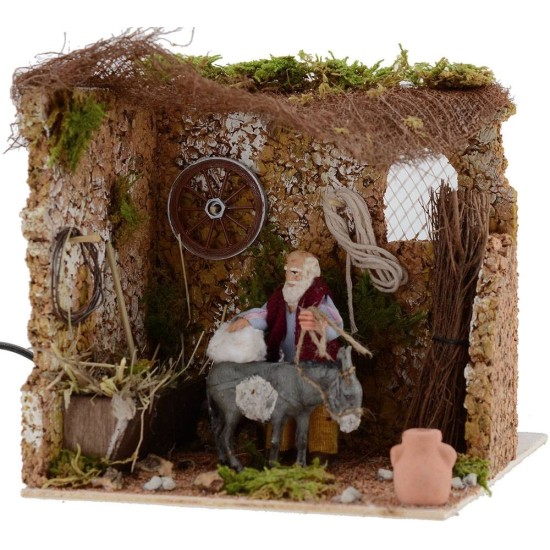 El viejo que cepilla al burro es de terracota y está vestido de tela, el movimiento resulta muy realista y funciona con corriente. Esta escena está realizada enteramente a mano en Italia y está bien acabada en los detalles: en primer plano a la derecha hay un jarrón de terracota, en el centro el burro y la estatua en movimiento; en la parte trasera hay un haz de leña, un cubo, una rueda y una cuerda colgada. A la izquierda se encuentra un gran comedero lleno de heno. El techo es realmente particular y le da un sentido de ligereza a toda la representación, de hecho, está compuesto por hilos de cuerda marrón. Al fondo, una ventana con reja que deja entrever un vistazo de tu belén.