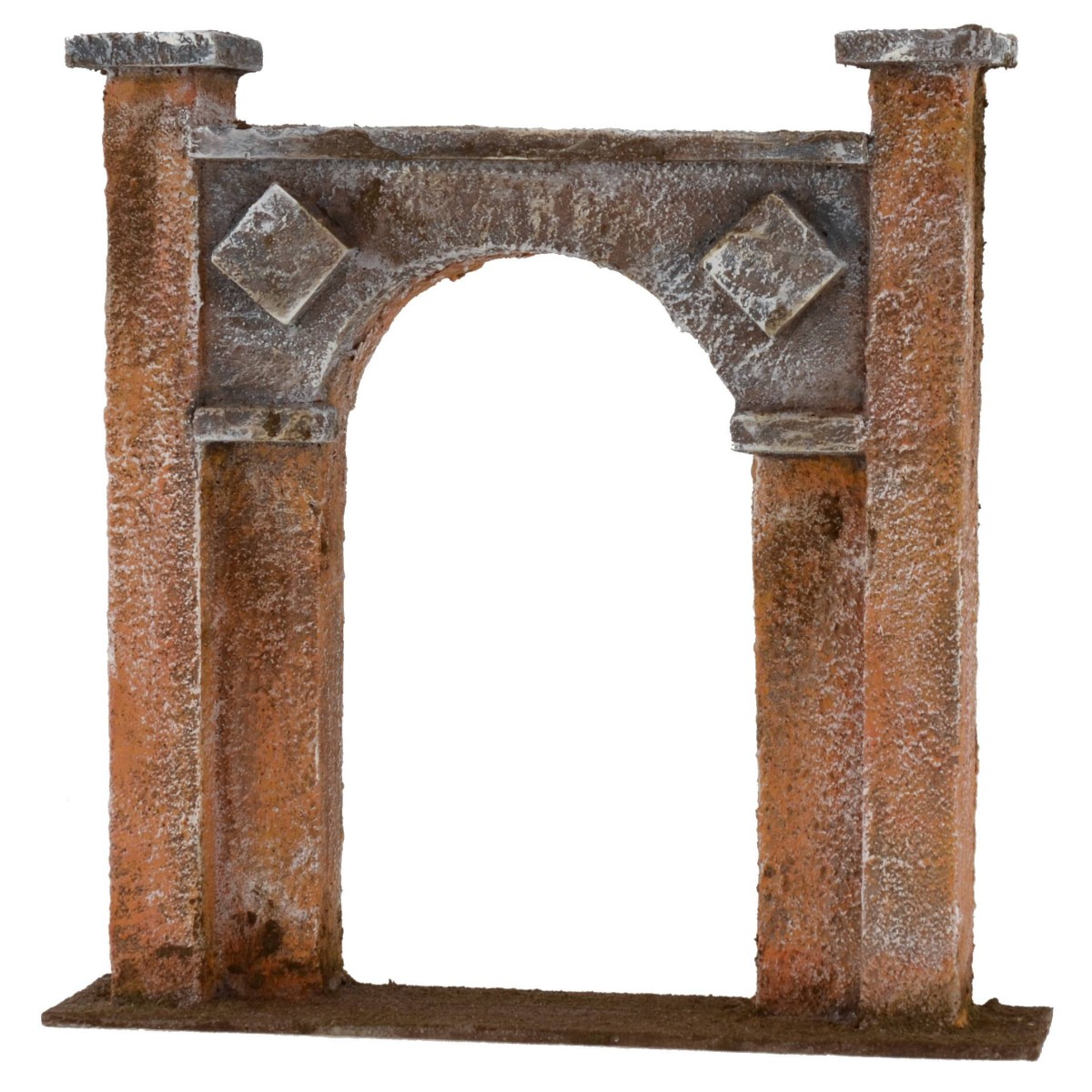 Puerta de entrada con arco de la ciudad, sostenida por dos columnas laterales que pueden representar el muro en el que fue colocada. Esta ambientación creada por artesanos italianos para el Belén clásico popular en Poliestireno y corcho, es adecuada para estatuas de altura 12 cm. Esta pieza puede ser utilizada para personalizar y decorar los ambientes exteriores de su Belén.