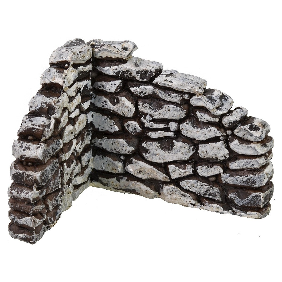Murete de esquina con efecto piedra realizado en resina. Un lado mide 4 cm, mientras que el otro 5,5 cm. El grosor del muro es de 1 cm, mientras que la altura máxima alcanza los 4,5 h cm.
