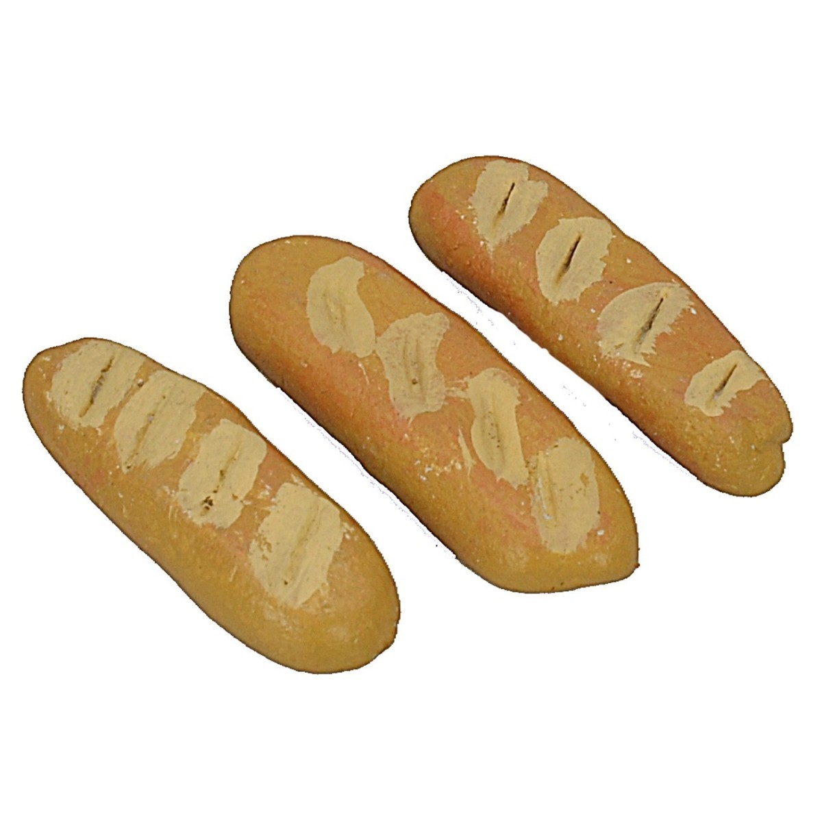 Juego de 3 piezas de pan tipo ciabatta bien acabado y detallado, es ideal para completar cestas, cajas y mostradores de panadería. El artículo es recomendado para estatuas de altura 10-12 cm.
