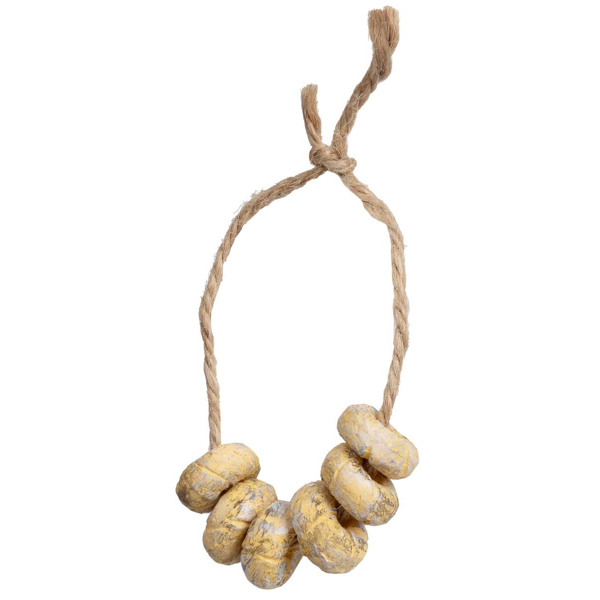 Rosca de pan atada con cuerda, compuesta por 6 panes con matices realistas. Este detalle es perfecto para completar cualquier pesebre hecho a mano, siendo particularmente recomendado para estatuas de altura entre 10 y 15 cm.
