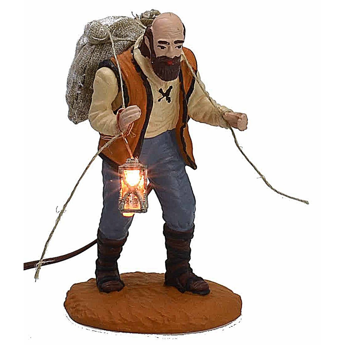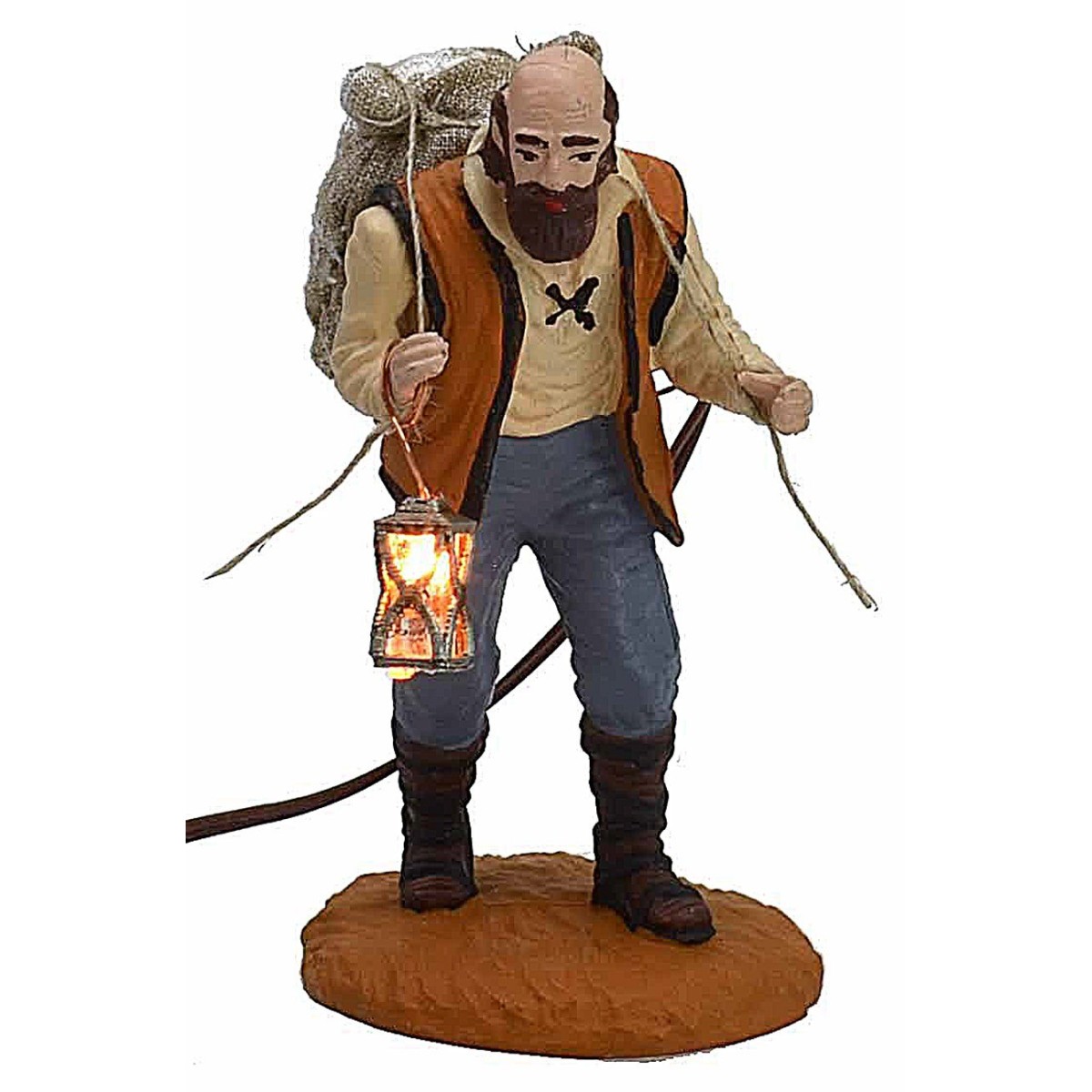 Linterna envejecida que funciona a baja tensión con LED de luz blanca cálida, recomendada para estatuas de altura de 8 a 10 cm. En las imágenes del producto se muestran fotos demostrativas de la linterna en la mano de un pastor. Para el funcionamiento, se puede conectar a los terminales del cable la clavija para baja tensión (no incluida), luego la clavija debe insertarse en el alimentador con un múltiple de tensión variable disponible en 5 o 10 tomas. Alternativamente, a los terminales del cable se pueden conectar los comunes terminales que a su vez se insertarán en el alimentador universal cortando el conector presente. Todos los accesorios mencionados anteriormente para hacer funcionar la linterna están disponibles en los productos relacionados debajo de la tabla.