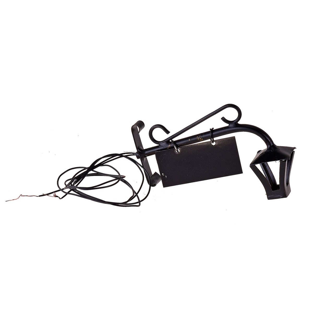 Farol de pared con brazo y letrero escribible, equipado con cable con luz de 12 v, el artículo se recomienda para estatuas de altura de 12 a 15 cm y es ideal para el Belén hecho a mano y modelismo. En los terminales del cable es posible añadir un cable delgado para conectar al enchufe de baja tensión (no incluido), luego el conector debe insertarse en el adaptador de corriente con regleta de enchufes de tensión variable disponible con 5 o 10 enchufes. Alternativamente, en los terminales del cable se pueden conectar directamente terminales comunes que, a su vez, se insertarán en el adaptador universal cortando el conector presente. Todos los accesorios mencionados anteriormente se pueden encontrar debajo de la tabla en los productos relacionados.