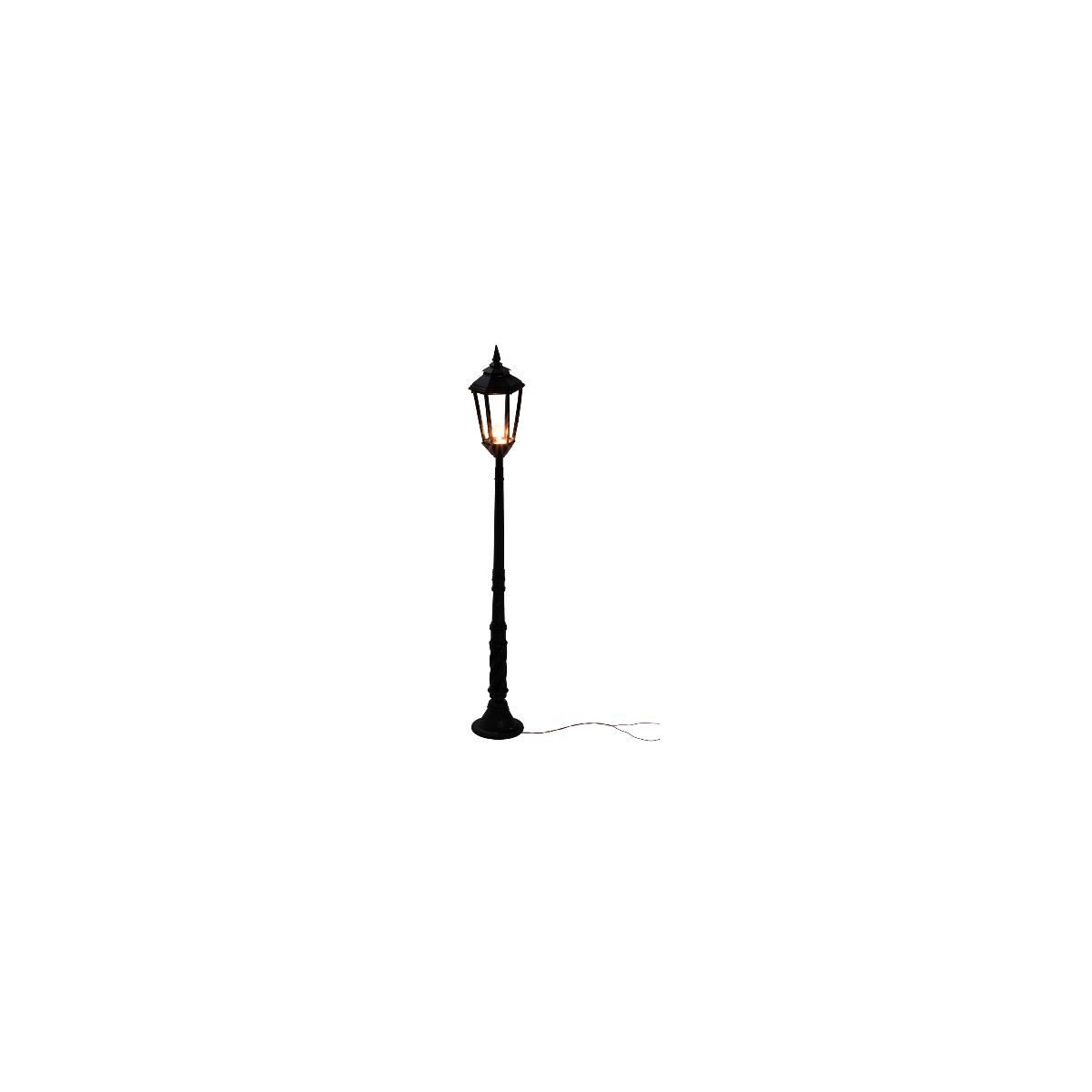 Farola de suelo equipada con un punto de luz de microlámpara de 12V con tono de blanco cálido. Es ideal para belenes hechos a mano y proyectos de modelismo. Es posible alargar el cable utilizando un rollo de hilo fino. Para la conexión, será necesario montar un enchufe para baja tensión (no incluido), para insertar en el adaptador múltiple de tensión variable, disponible en versiones de 5 o 10 tomas. Alternativamente, es posible conectar todo utilizando terminales comunes para fijar a los extremos del hilo. Estos pueden ser insertados en el adaptador universal, previa eliminación del conector presente. En los productos relacionados bajo la tabla están disponibles los accesorios mencionados anteriormente.