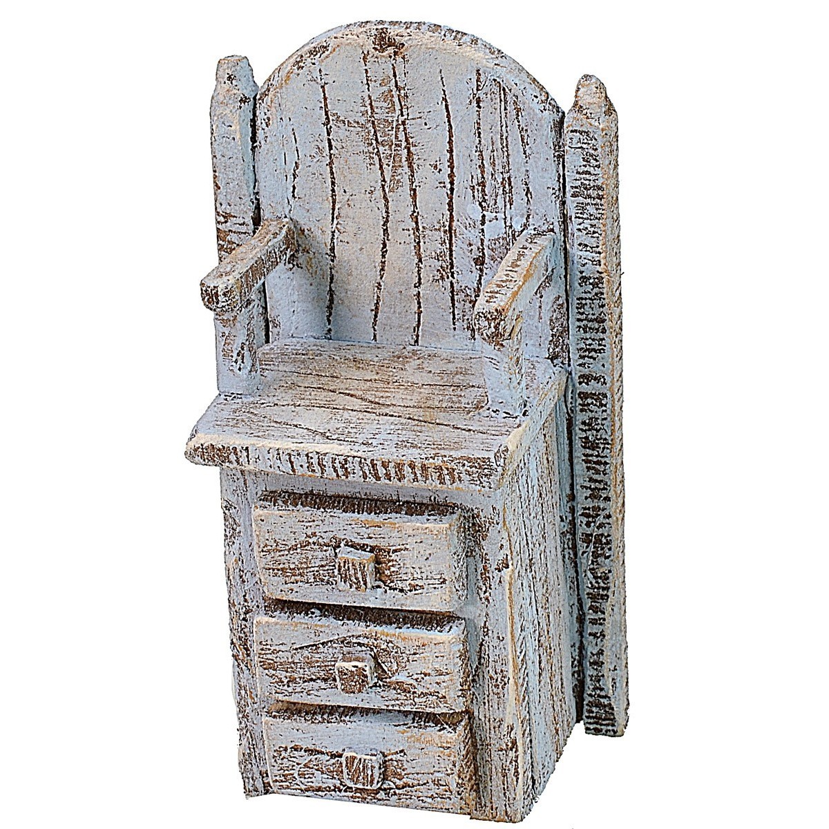 Silla artesanal de madera con reposabrazos y 3 cajones, recomendada para estatuas de altura 10 cm.