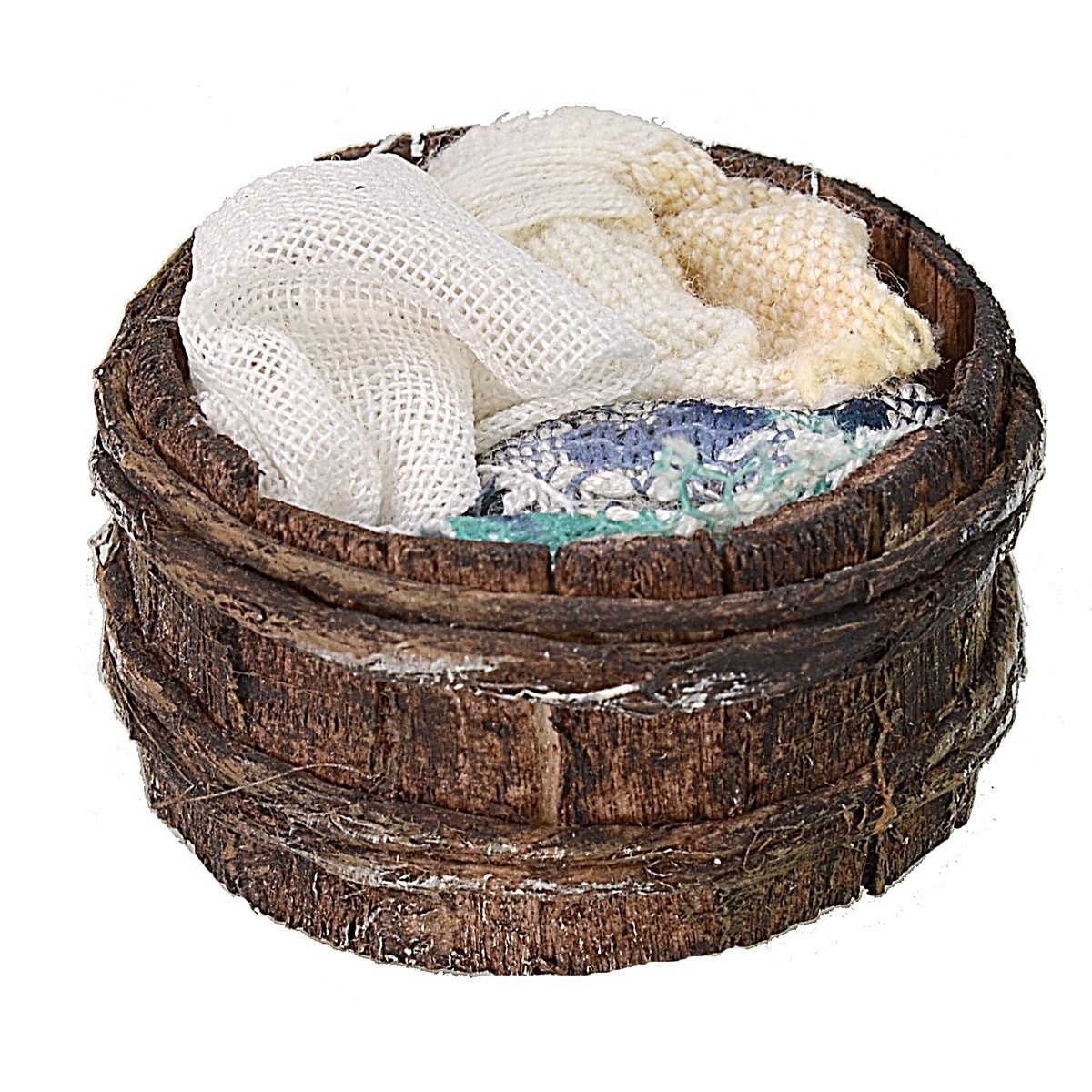 Tina de madera que contiene la ropa para lavandera, artículo realizado completamente a mano recomendado para estatuas de altura 10-12 cm.