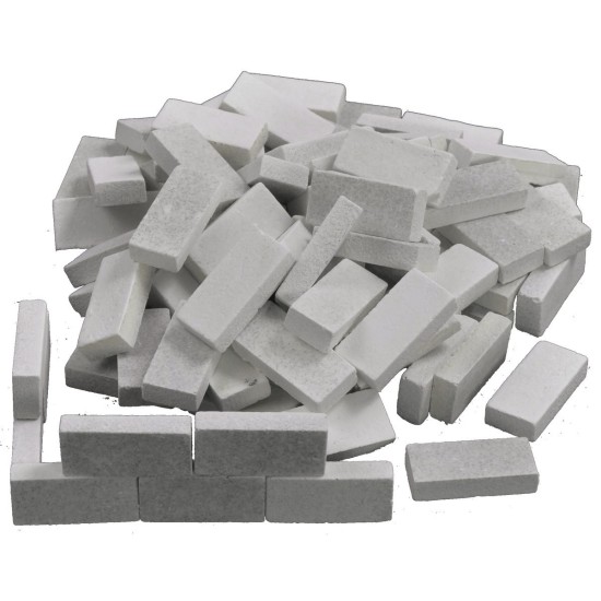 Ladrillos blancos con un lado efecto granito para belenes y modelismo, ideales para construir muros y paredes de las viviendas. Se recomienda utilizar pegamento vinílico o caliente para la fijación, mientras que un sellador para recrear las juntas entre un ladrillo y otro; tanto los pegamentos como el sellador están disponibles en los productos relacionados debajo de la tabla. Los paquetes son de 90 o 300 piezas, para elegir el formato deseado será necesario seleccionar el menú desplegable situado encima del botón "añadir al carrito".