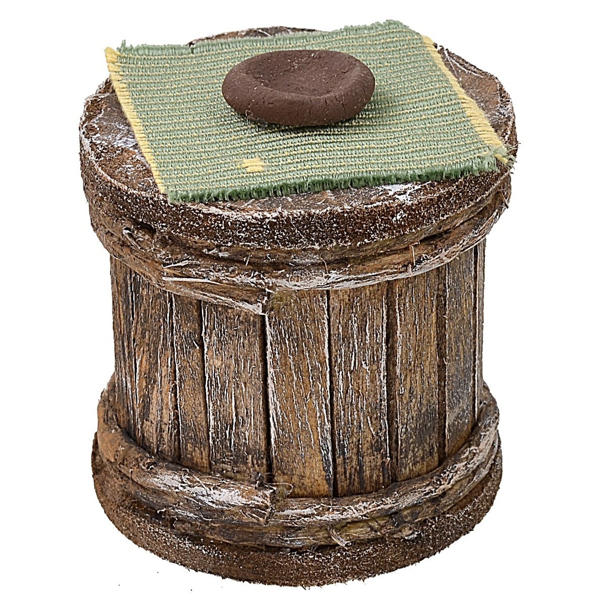 Mesa de madera con plato y mantel y dos taburetes, ideal para la creación de escenografías para su Belén; recomendado para estatuas de 12 cm.