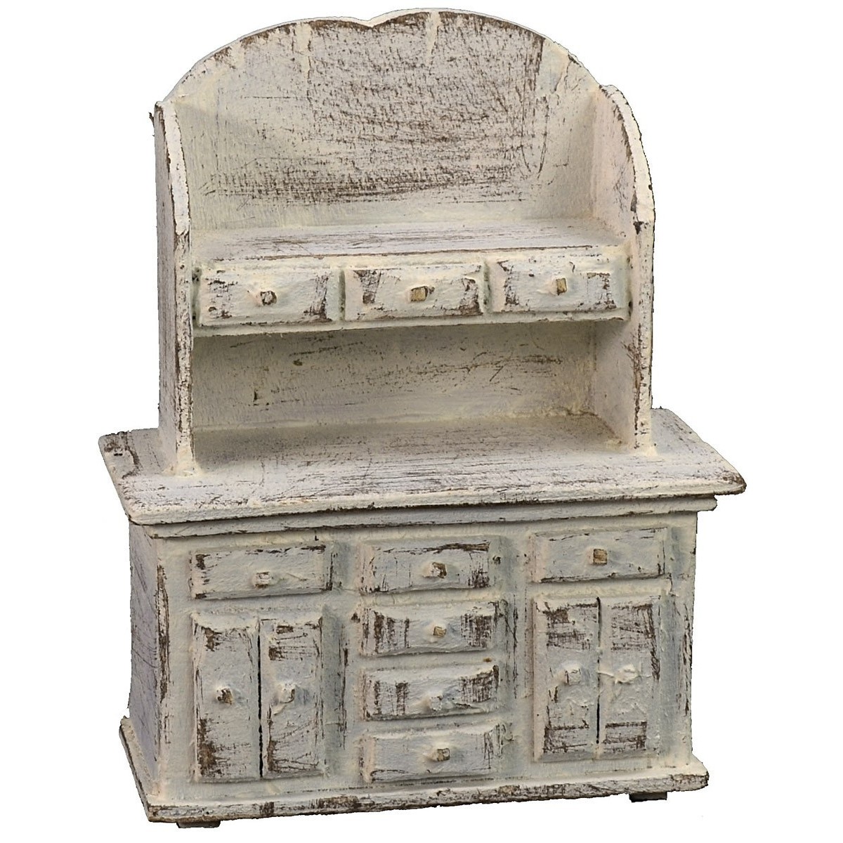 Aparador de madera blanca compuesto por varios cajoncitos tanto en la parte inferior como en el estante superior, donde es posible decorar utilizando las minucias disponibles en nuestra tienda. El artículo ha sido producido por artesanos italianos y se recomienda para estatuas de altura 10 cm. En los productos relacionados debajo de la tabla se encuentran otros complementos de decoración de la misma serie para completar sus ambientes.